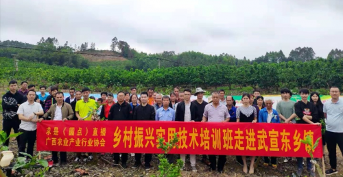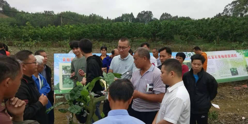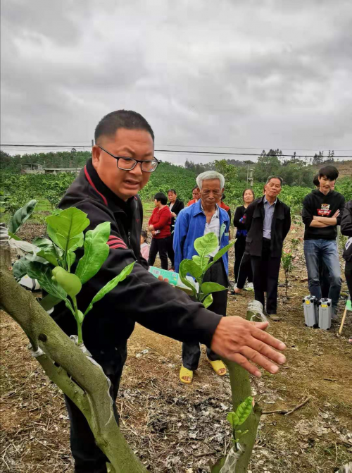 ——圆点直播与广西农协会携手植保专家开展科谱下乡活动 4月13日上午9时30分, 广西武宣县东乡镇风沿村委万亩三红蜜柚种植基地,鸟语花香,喜鹊欢歌,春意盎然。 一大早附近的50多位村民有老的、有少的、有背着小孩的不约而同聚集到该村委上风沿屯的柚子果园地,果地两旁分别排放好了20多米的宣传展架,村委干部韦相科副主任与一帮群众己在果地里交谈。 村民谭大哥讲,今天他是特地起早赶过来听农技专家讲柚子果种植管理技术课的,因为这几年村里每户都种上了三红蜜柚,他本人也种植了20多亩,但因为缺乏技术,种植几年了,产量不高,品质跟不上,收入很低。今年初,他把原来自家种植的三红蜜柚果地与村里的部分果农参与了高位嫁接品种改良为泰国红宝石青柚,希望能提高产量,增加收入。