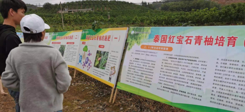 今天的培训班和以往不同的是不把课堂设在会议室或教室里,直接把课堂设在山坡的果地里。果地会场两边摆列着20米左右的展架,产架上图文并茂地描述了泰国红宝石青柚的嫁接、剪枝、施肥、保花保果等一系列科谱知识。