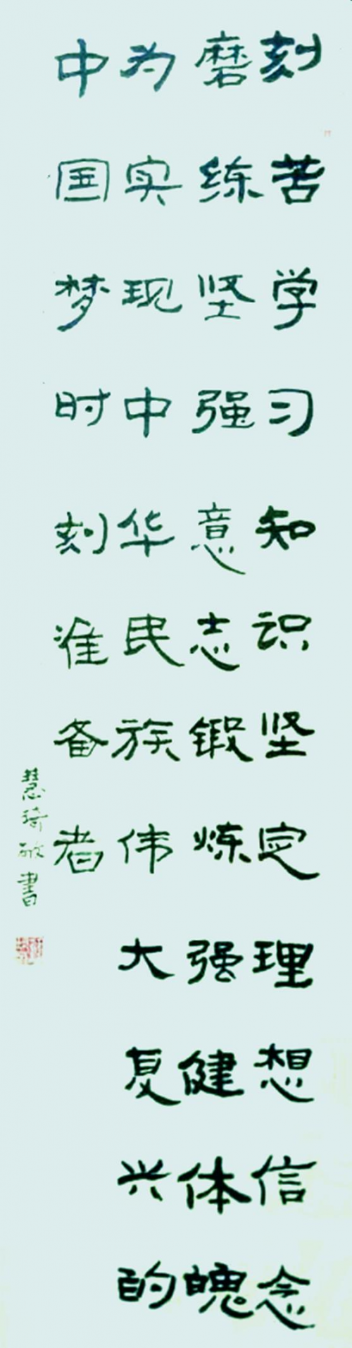 《为中华崛起而读书》 在社区,大家都称赞小慧琦是个懂事的好孩子,尊敬长辈、诚实守信、遵守公德得到邻里好评。 在完成学业课程基础上,挤出时间学习书法,学习过程中从不叫苦叫累,在母亲的指导下,先后学习了《多宝塔》、《勤礼碑》、《曹全碑》、《兰亭序》。从字法、线法、笔法、墨法、章法“五法”入手。楷书学习遵循“平、直、均、密、锋、力、轻、决、补、损、功、称”12字原则。隶书学习掌握结构、结体、用笔等方法。行书学习掌握自然优雅、秀美飘逸,每一笔从入纸、牵丝、提、按、转、折反复练习,掌握其要领。