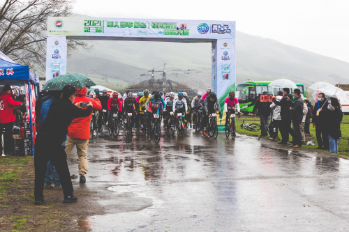 精英组选手雪中登顶天鹰台 第二赛段以那拉提国家旅游度假区游客集散中心为起点,途经天丰台、天云台、天界台、恰普河、天牧台,到达终点——游牧人家。赛道全程19公里,最低海拔1416米,最高海拔2102米,充分考验了选手的爬坡能力。风和日丽的空中草原上,顶冰花成片开放,随风摇曳生姿,像是在为奋力骑行的选手们呐喊助威。