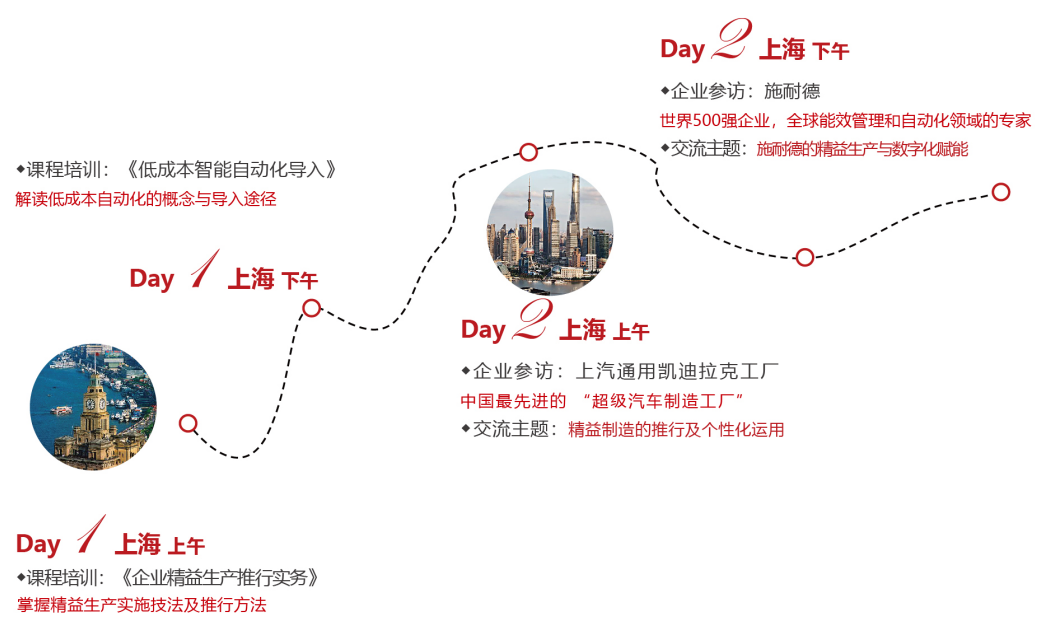 该标杆游学将直接对话精益管理专家,系统的掌握精益思想及低成本自动化思想与工具。亲临2大精益自动化生产现场,观摩大型智能制造现场与自动化物流体系,学习效率与品质管理。 上汽通用凯迪拉克工厂 前往上汽通用凯迪拉克工厂学习凯迪拉克的效率及品质实现手段,并了解其自动化物流体系与智能化工厂样板,学习精益制造的推行及个性化运用。