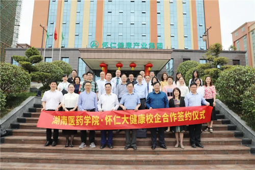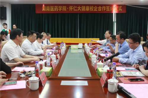 2021年5月11日,怀仁大健康与湖南医药学院产学研校企合作对接会暨合作签约仪式在怀仁总部隆重举行,湖南医药学院校长何清湖、副校长李峰、饶利兵,护理学院党总支书记黄文杰、康复医学与保健学院党总支书记陈继松、药学院院长吴卫华、科学技术处处长黄雪霜、发展规划处副处长李青、继续教育学院党总支副书记尹丽,特邀嘉宾湖南中医药大学副院长谢梦洲、处长田雪飞、陈小平教授、骆敏教授、严喧喧副教授、胡宗仁博士后、刘露梅博士后,怀仁大健康董事长兼总裁林承雄、党委书记兼副董事长陈毳萍、常务副总裁姚亮贤、董事兼博世康总经理蒋忠全、总裁助理兼人才发展中心总监徐坤、董事会秘书林可可等领导出席,湖南医药学院副校长李峰主持签约仪式。