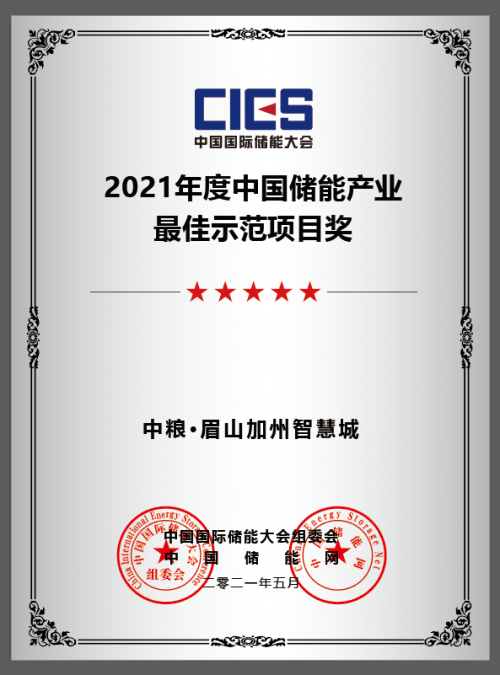 随着项目建设推进和企业招商逐步落位,项目受到了社会各界高度关注和业内专家广泛好评,在5月24日的“储能之夜”晚宴上,中粮·眉山加州智慧城被授予“2021年度中国储能产业最佳示范项目奖”。