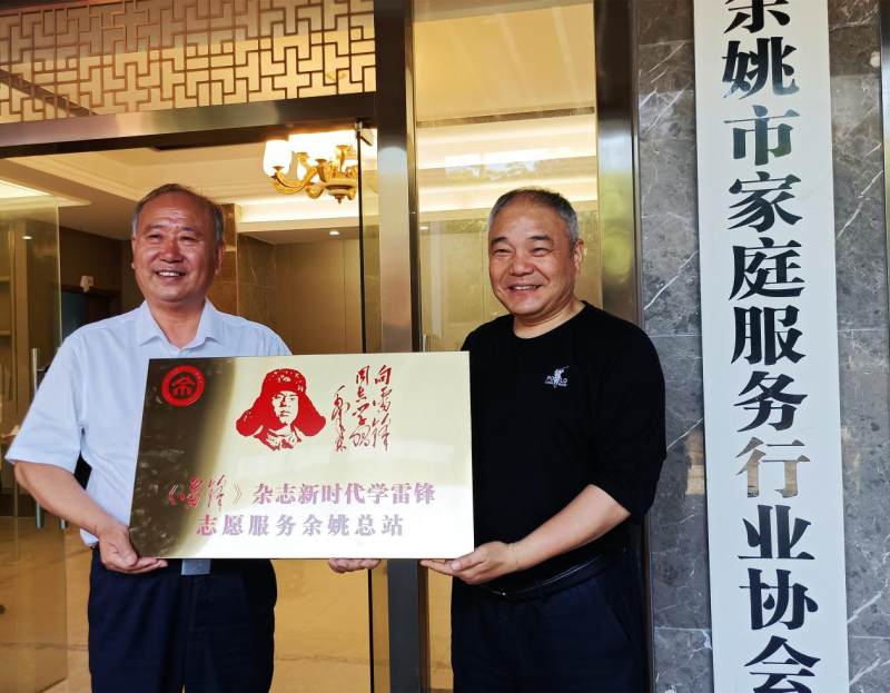 本月30日下午,余姚市家庭服务行业协会秘书长许建军从《雷锋》杂志总编辑陶克将军手中接过《雷锋》杂志新时代学雷锋志愿服务余姚总站铜牌,标志着我市自2021年4月21日经总站批准成立余姚站以来正式落成市家协。