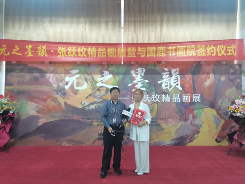 张跃玫向朱总编介绍了自己的成长过程,坚持走绘画职业道路;将自己多年积累的绘画经验和梦想的蓝图呈现给社会,回报社会;讴歌伟大的新时代! 同时,张跃玫表示,感谢多年以来在家人和朋友的帮助支持下取得的成绩;将不负众望,不忘初心,砥砺前行;创造并勾画出绚丽多姿的富有时代朝气的杰出佳作!作为职业画家,一定要怀着美好的梦想,拿起腾飞的武器;为人民享有美好生活的新时代奉献自己的美篇! 新华在线网朱总编祝贺“元之墨韻”张跃玫精品画展开幕式暨与国鹿书画院签约仪式圆满成功! 希望张跃玫精品画展仅仅是张跃玫创作艺术上一次检阅和鉴定,坚信“努力一定成功”的哲理和“青出于蓝而胜于蓝”的不懈奋斗的初心,不负众望;期盼着张跃玫创造出“可歌可泣”的每一篇完美画卷,展现在关心张跃玫成长道路上每一位朋友、师长和享受美好生活的每一位观众面前!