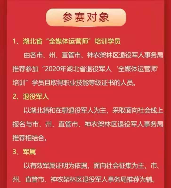 资金、项目、产品、学历、经验、关系等条件限制,成为退役军人、军属创业就业最大的拦路虎。承办本次直播大赛的湖北战友企业管理集团有限公司负责人介绍,由退役军人事务部退役军人培训中心、广电总局教育培训基地、湖北省退役军人事务厅联合主办的退役军人“全媒体运营师”成果展示暨“战友杯”直播大赛,坚持靶向思维,重点从新职业开发、针对性培训、就业服务、权益保障等方面强化扶持,一路有良师益友相伴,有系统化的培训和辅导相随,呈现退役军人、军属创业就业多元化人才孵化,激发退役军人创新创业创造动能,助推科技创新成果转化应用,服务国家创新发展,提升退役军人、军属创造力。 据了解,本次直播大赛主要面向2020年度湖北省退役军人“全媒体运营师”培训取得资质的学员1000名、湖北籍及在鄂工作的退役军人1000名和现役军人的军属、退役军人的军属1000名,以电台导师、网红导师、企业导师、创业导师为主的导师团,以战友团、亲友团、企业团、直播团为主的助力团,以授课、比赛、投票、带货为主同步赛,提升退役军人、军属创业就业创新创造精神,展现直播大赛塑造力。 目前,直播大赛已经开始报名,采取组织推荐与自主报名相结合方式进行, 由各市(州)退役军人局和活动组织机构对参赛人员资格进行逐一审核,按分配名额数量推荐上报,也可通过扫描二维码或在微信App中关注公众号 “湖北退役军人”进入报名通道,根据提示信息完成报名,参赛选手报名的直播账号仅限抖音或快手平台,每位选手限报1个账号且不可更改。(朱铭 郭邓林 ) |