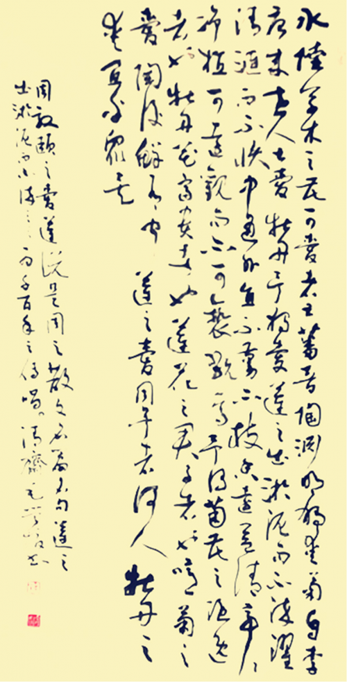 毛学校把草书、楷书、汉碑、汉隶、行草等字体集中变形,融汇于一体;同时结合大草的笔法使得作品连绵不断。其笔触,毫不拘泥概念化的规范,而是随手生发,或中或侧、或方或圆、或藏或露、或敛或纵,触处成形;其结体,则善于随形布势,或铺张排比、或敛聚收放、甚至依倚穿插,应心隐手。在具象与抽象中,展现出中国书画同源的艺术精髓;在山形云影、风帆飘动中,诠释着中国文字博大精深的象形表现力。这样的结合使文字变得有金石铁声,飘逸洒脱,大气磅礴、自然合道,宛若天成。而这种独特的书写风格,则促成并终而奠定了他在书坛坚不可摧的独立地位。