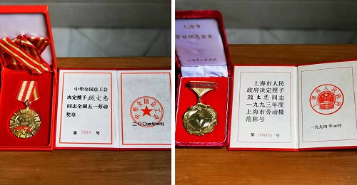 佩戴上海市劳动模范、全国五一劳动奖章的留影