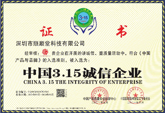 深圳市顺顺堂科技有限公司,在2021年3.15国际消费者权益日之际,该公司凭借诚信守法、重质重量的企业作风荣获中国3.15诚信企业荣誉称号,获得了社会和消费者的肯定,也充分证明了顺顺堂科技维护经济市场安全有序发展的一份责任之心。