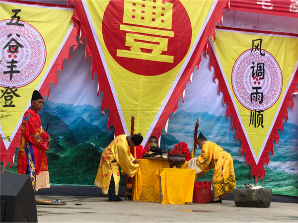 2021年广西环江•毛南族分龙节暨第七届世界自然遗产文化旅游节活动现场 张春梅/摄影 毛南族“分龙”民间传说演绎——五龙布雨,寓意着祈求毛南山乡风调雨顺、五谷丰登,体现毛南族人对美好幸福生活的向往。