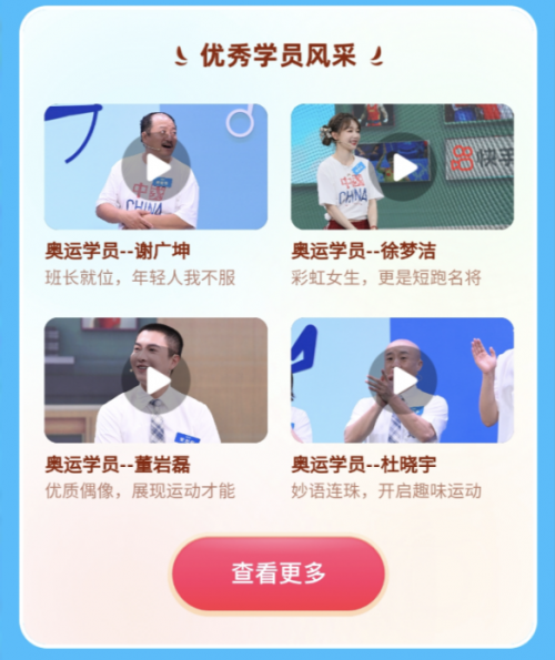 据悉,该节目采用模拟中小学生课堂的形式,由火遍全网的“奥利给大叔”担任校长一职,李响、黄健翔等知名主持人作为班主任和指导员,秦凯、李晓霞、鲍春来、丁俊晖等17位体育大咖出任冠军导师,带领开心麻花多位艺人、“谢广坤”扮演者唐鉴军、“火箭少女”徐梦洁、董岩磊等人气明星,以及朱傲宇、烫头小丸子、铁豆、笑起来没眼睛的播音生等快手达人在互动游戏中,为老铁们献上了为期17天的“奥运课程”。