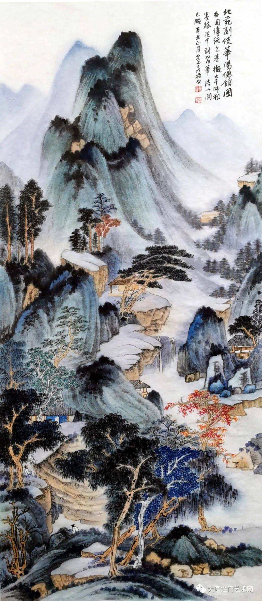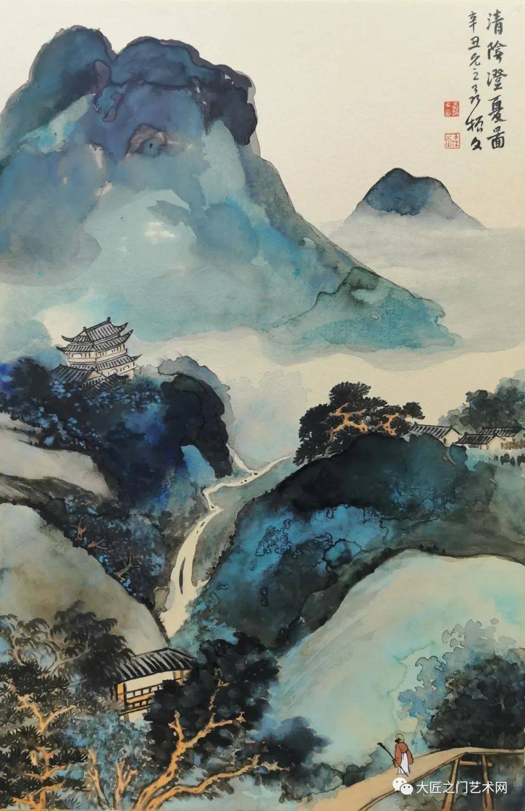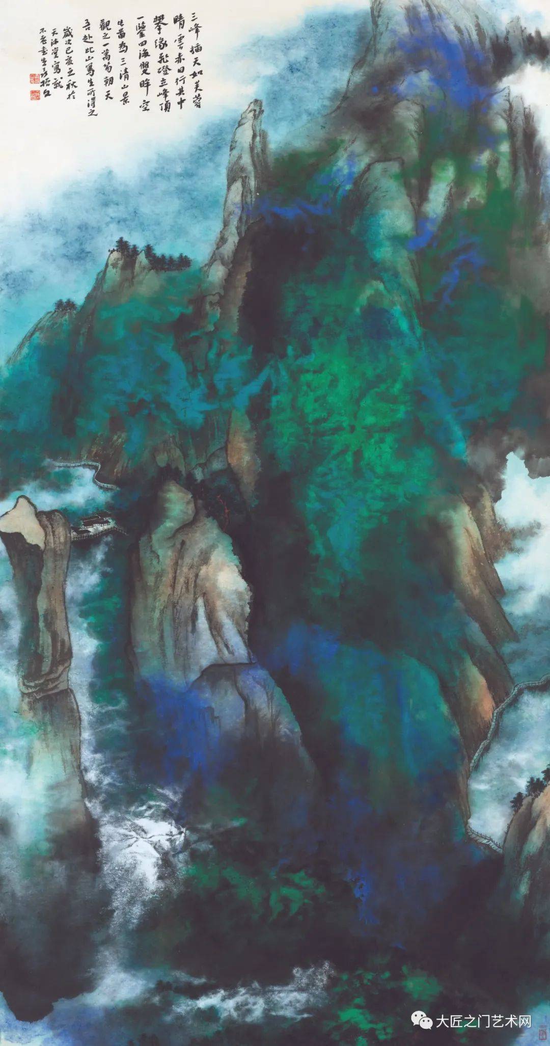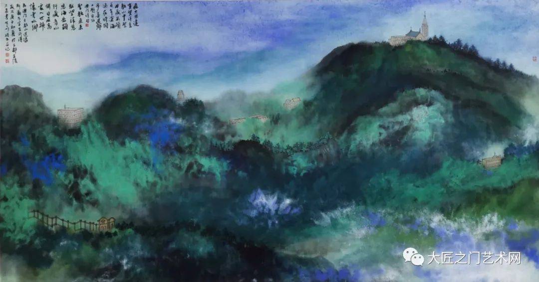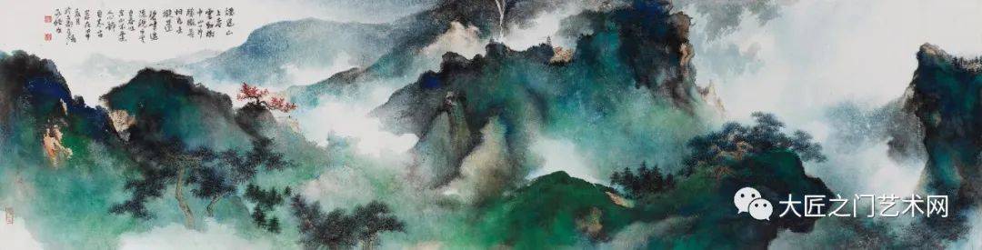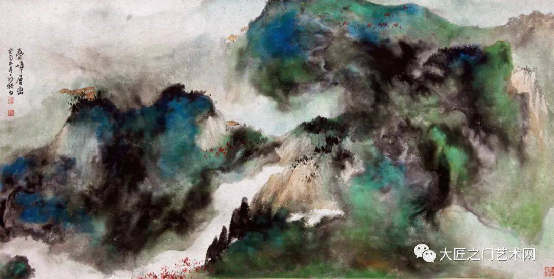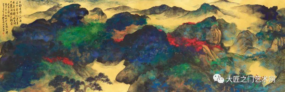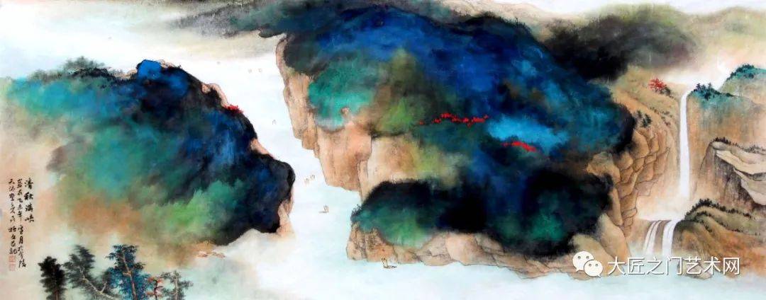至于泼彩山水,20世纪才由徐悲鸿称之为“五百年来一大千”的张大千在海外开创。至此,泼彩山水才与水墨山水、浅绛山水、青绿山水和没骨山水一样,成为山水画的一种体格,以前所未有的艺术美,影响于画坛,标炳于史册。然而这种艺术美,绝不是表面的悦目,也不同于西方抽象表现主义,而是以流动变化的泼墨底色,衬托出泼彩青绿的夺目光辉,又以“无常形有常理”的大面积的岚气山光与“有常形”的屋宇、桥梁、舟楫、人物细节结合。泼彩山水,不仅体现了魏晋以来的“澄怀观道”“与天地精神相往来”,而且表现了“可望、可游、可居”的精神家园。