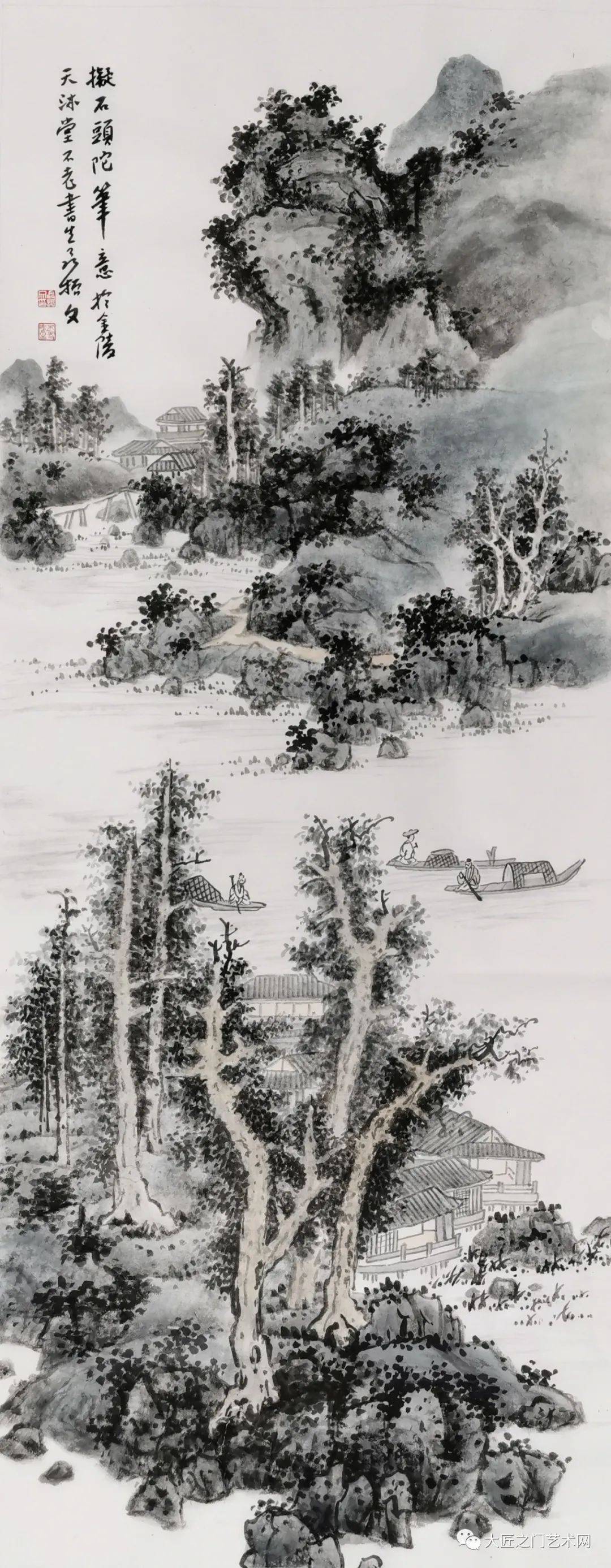 再一种是学古人的。是从构图、气息、笔墨几方面加固传统基础,作品主要为水墨,亦有浅绛淡色。其中学蓝瑛的最多,包括蓝氏的多种面貌,如《幽谷春烟》《拟石头陀笔意》。也有学渐江的,还有学八大山人的。学八大的有《风顺千年过》《扬帆迢迢探友来》,均构图空灵,画法简当,用笔圆润,有八大之简逸。后者一河两岸,小树用没骨法,枝干赭色,如斜阳照射,可见是综合倪瓒、八大和董其昌的没骨山水而成,体现出聂振文在学古中求变的精神。