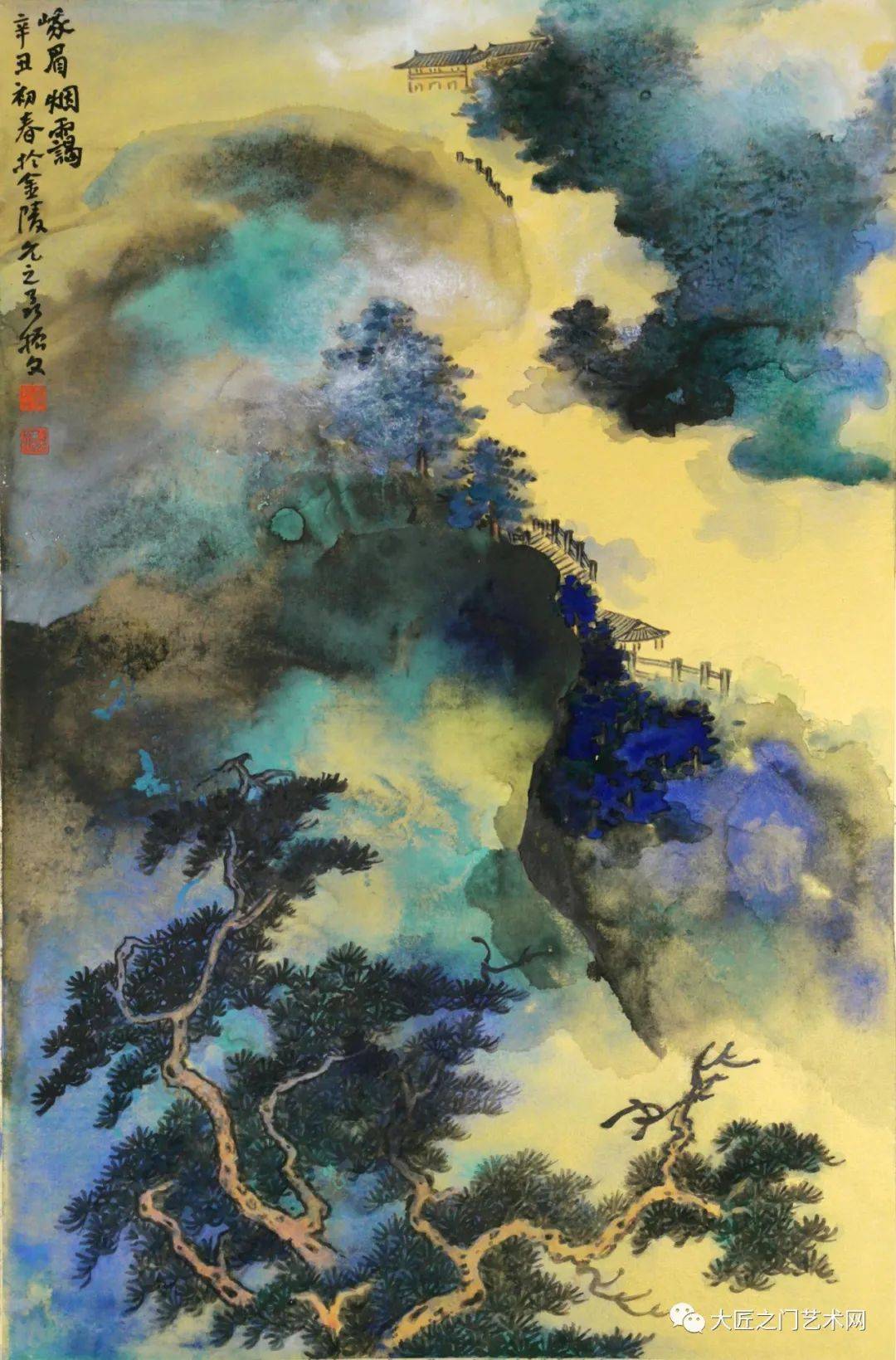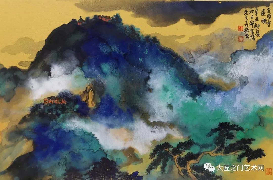 《武夷山》(2020)是由写生而来作品中的佼佼者之一。此图作于金笺之上,山势蜿蜒层叠,涌动如大海波涛,尽显峰峦岩壑之美,画法则始而规模二米,作泼墨云山,但在泼墨中,时亦隐现山骨钩皴,继而在泼墨上破之以石青石绿与朱磦,顿觉眼前青嶂叠翠,绿树含烟,阳光夺目,红云出岫。因为综合了线与面,墨与彩,水与光,实境与幻境,很成功地把大千的泼彩与本人写生的感悟有机地结合起来,在艺术上也趋于完美。上面有自家题跋:“谷静溪清一水开,遥望青嶂似蓬莱。层崖峭壁堪留醉,不觉闲游近鹤台。武夷山题记”。诗画相生,记载了游山中的惬意。