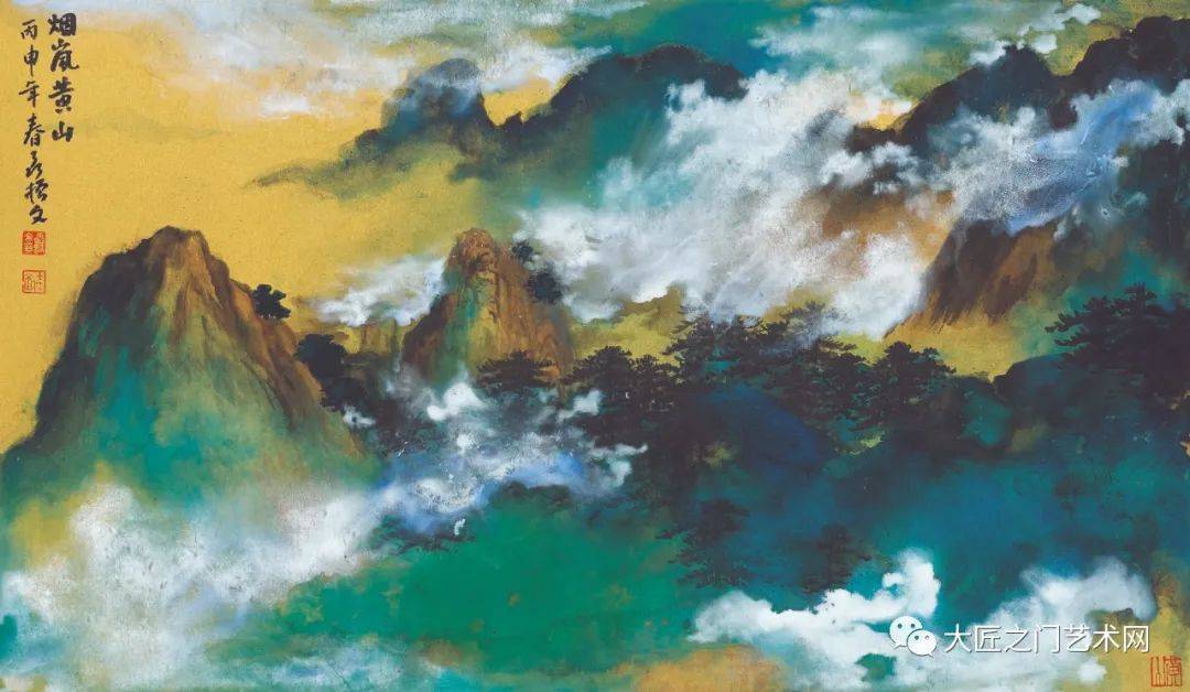 其二破墨与泼彩浑融一气。或作全景,或作边角,率皆色墨互渗,圆融无碍。《杖履观瀑》作边角构图,烟岚壁立,浓云笼罩,奥秘幽深,飞流直下,山下桥上,有人观瀑。布局极简,墨色浑融无间,笔踪隐现其内,烟岚流动深厚,瀑布隐然有声,气韵生动。《雾锁黄山》画云漫高山,云气升腾流动,游走的白云与青翠山岚交映,破墨与泼彩交融,上题宋人汪兼山诗:“谁能炼得娲皇石,我亦叫开阊阖门。早起蒙天微一笑,依然云气薄昆仑。”其破墨泼青极为浑融自然。