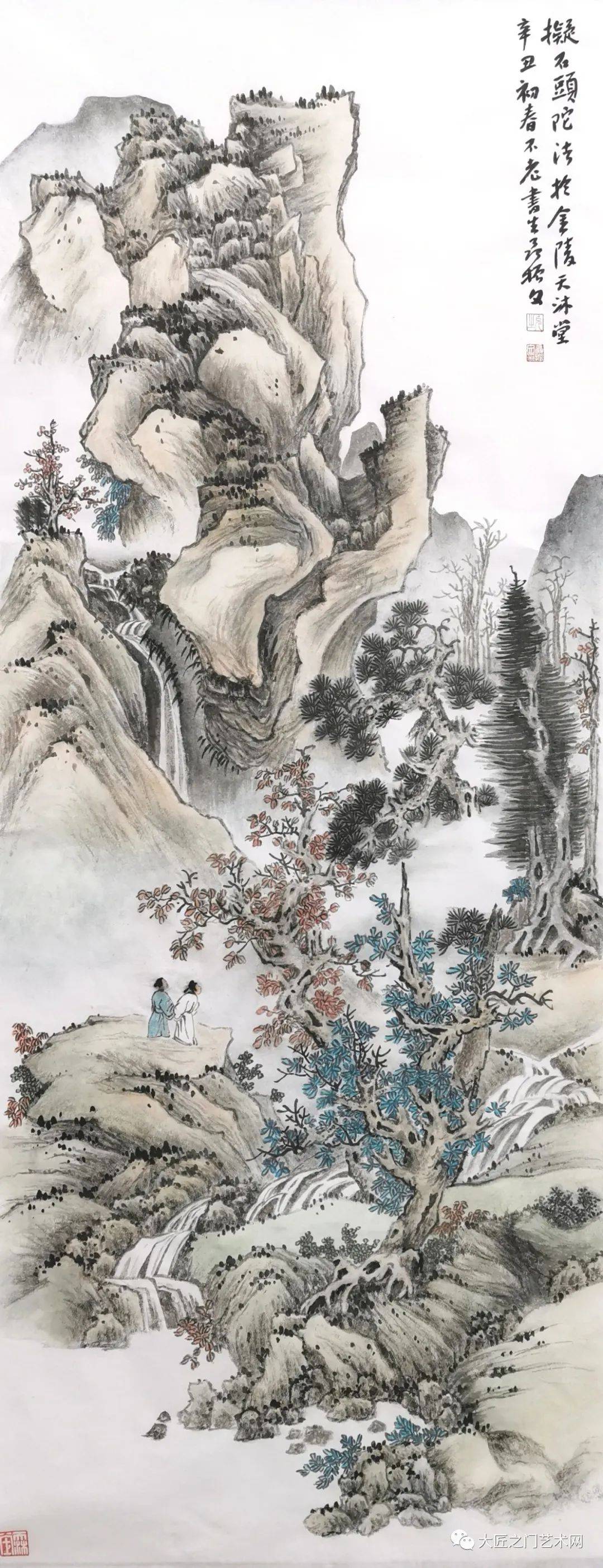 以上泼彩作品,大多作于2016年以前,尽管渊源于前人,但注入了自己的感受,不少作品已经比较完美,因此赢得了一致好评。然而,志存高远的聂振文,遵照“读万卷书,行万里路”的古训,总结前人“诗书画一体”的经验,从2016年开始,不断游历祖国名山大川,进行采风写生,足迹遍及30余个省份,增加泼彩山水的源头活水。而且为了升华感兴,锤炼意境,从2019年自学近体诗,用平水韵,讲平仄,融画意于诗情,他的艺术也进入一个格局更大诗意更浓以实境求神境的全新阶段。