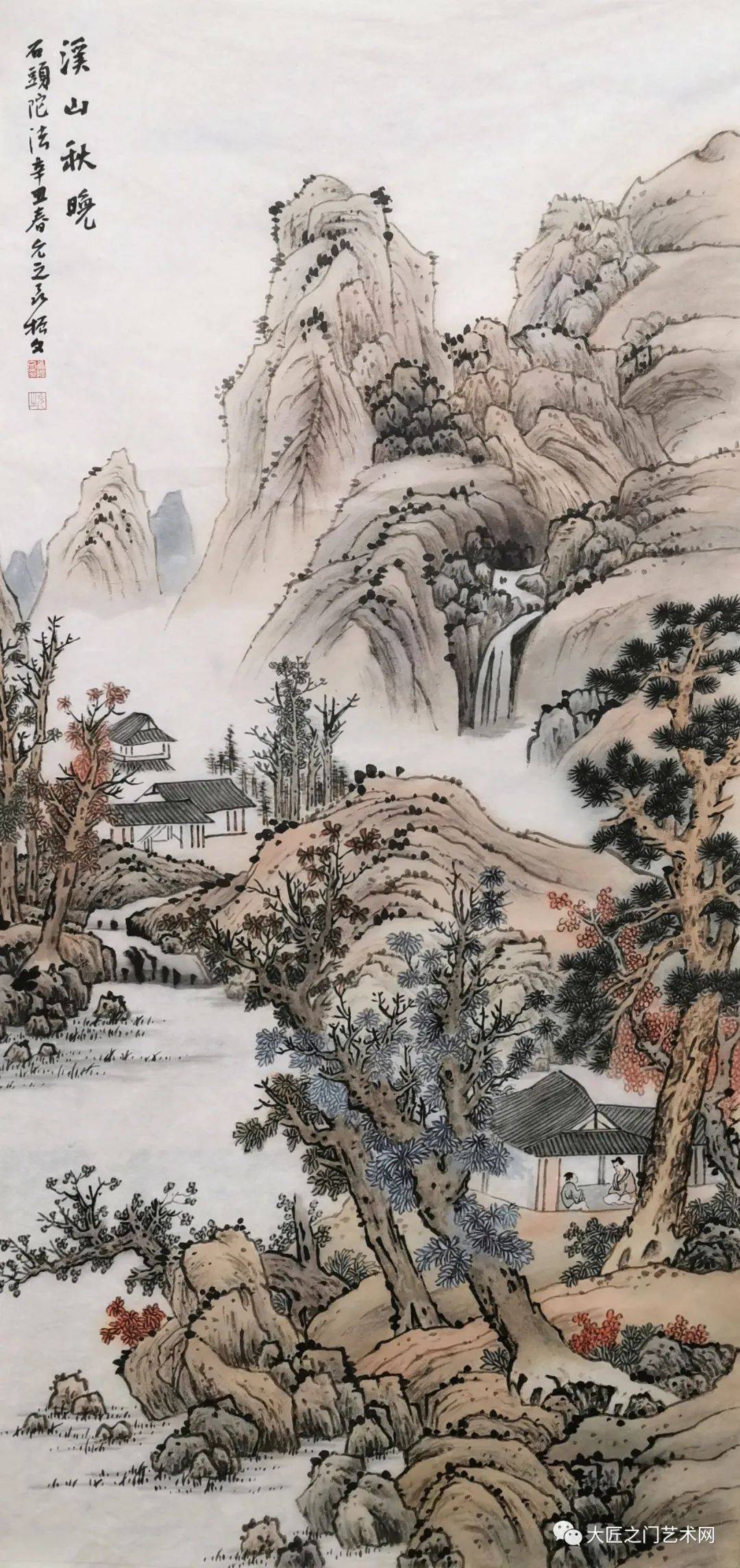 其三泼彩破墨鲜明夺目。《 江山胜览》《翠岭秋华》等,或画群山蜿蜒,或画观泉论道,无不突出了泼彩鲜丽的植被山岚和其红如火的红叶点点。而《烟岚黄山》《清秋揽胜》《浩然天地秋》与《无题》团扇等,均作于金笺纸上,无论画群山深谷、绝壁渔舟,还是高山流泉,都在破墨泼彩的作品中,巧妙利用金地、白粉、朱红、澄黄等色彩的泼洒、流动和沉淀,辅以点笔渲染,形成了灿烂辉煌有写意味道的金碧山水。