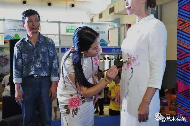 秦子惠在东盟博览会旅游商品展会现场绘制旗袍