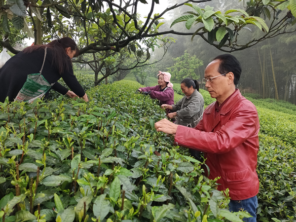 4月13日,沐川县老科协会长李正银到牛郎坪现代化茶产业园区调研茶叶生产、市场行情和茶农增收情况,深入到被茶园包围的富新镇新塘村,成片的水果+茶园连接在一起,像是铺了一层绿色地毯,非常壮观。茶林绿叶丛中鲜艳夺目的樱桃,金丸佳实的枇杷,云端茶飘香 美景醉游人。接着,李正银会长与茶农一起全天候采茶,亲身感受茶农的辛酸苦辣与勤劳致富的喜悦。