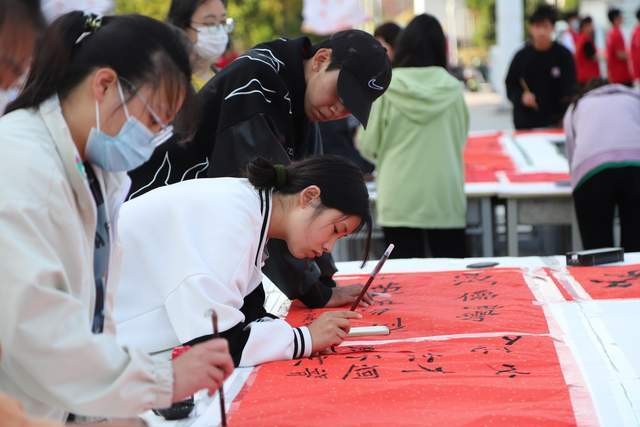 【“百米书卷致百年”】 4月20日,南阳师范学院“百米书卷致百年”活动在逸夫楼广场开展,广场左右两侧火红的团旗、校旗飘扬,二百余名青年学子意气风发、挥毫泼墨、飘逸洒脱、书写芳华,将共青团百年来的风雨征程、峥嵘岁月凝聚笔尖,百幅行云流水、一气呵成的书法作品排列成“100”字样的阵型,为团的百岁生日献礼。这项活动还吸引了在校国际留学生参与其中。