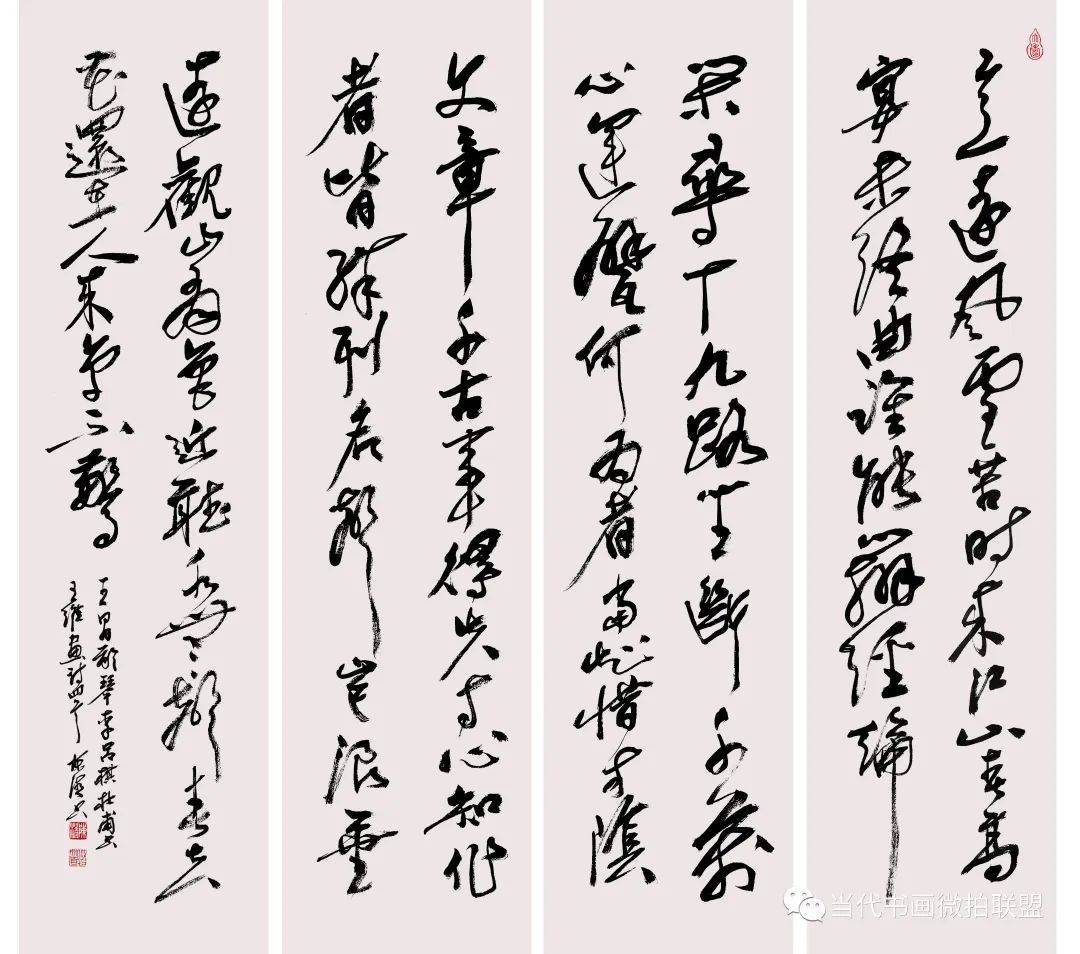 琴棋书画 陈清/作 138cm×34cm×4 读陈清先生的书法,首先让我感受到的是他对书法艺术的追求有着独特的思考,笔墨中透出他的睿识。