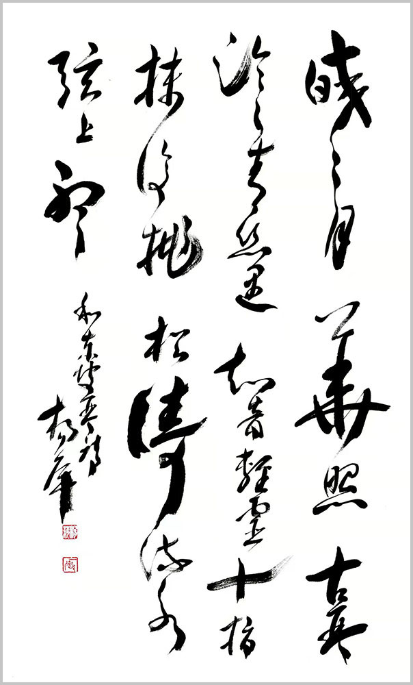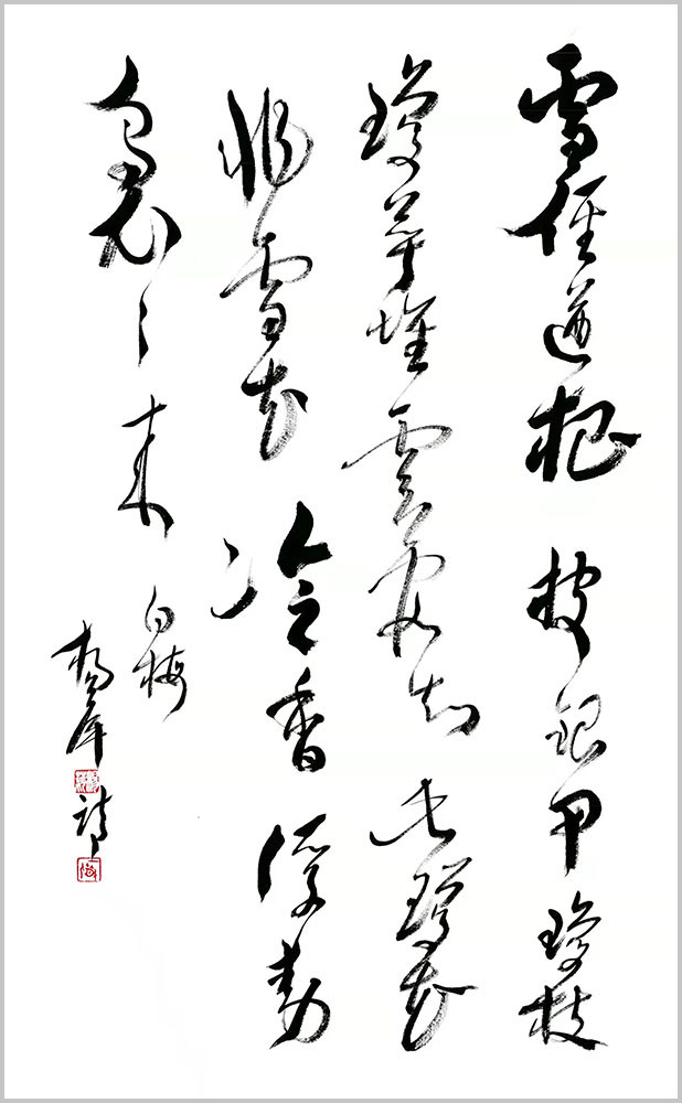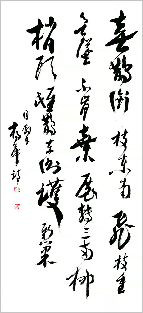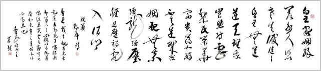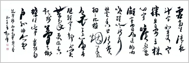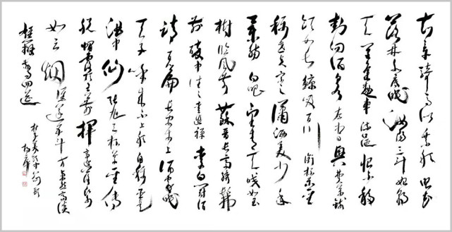 杨萍自作七言律诗草书《阮籍》 杨萍女士的书法之所以赋予其严肃而独特的艺术内涵,是因为她内在的修为与境界的升华,赋予作品诗意的美感。在主观理念、意蕴、才情的驱动下,善于汲取、变通、融化、创新。在她笔下,书法的意趣与传统古法一脉相承,从博大精深的中国文化细微处体悟书法应有的蕴积和厚重,以古朴、简洁、灵动的笔法笔意,体现出灵动、清明、超逸的艺术品格。将诗词文学与书法艺术融会贯通、以文书意,让作品中无不蕴藏着深厚的文化内涵。通过杨萍女士的作品可以看出,习古而不拘泥,创新而守法道,用笔气韵流畅、刚柔拙巧,秀丽中不乏挺拔,苍劲中不失含蓄。书法的意趣和笔墨线条的韵律表现出博大圆融的境界和追求自然的精神。作品整体上看起来秀丽、温婉,线条不以厚重取胜,而在恬淡中表现其运笔的畅达与精致,于洒脱之中见灵秀之气,以儒雅骏逸的艺术风格保证了字里行间的精神之气。通过其作品,窥其创作心态的自由自在,意趣盎然,笔划之间尽显淡然韵致,洋溢着一种清雅的艺术品味,正是这种特有的抒情格调,显示了他书法中的正大气象。