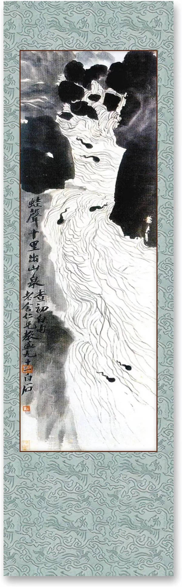 ----蛙声十里出山泉之句,为齐白石命题作画,方有这张让人似乎听见青蛙叫声的传世名画,这可能就是秦袓咏先生所说的歌笑出地。如果用萤火一星沿岸草命题为画呢,当今画家能画出齐白石的水准吗?还记得《老残游记》中形容某一评书艺人声调之变换: “几啭之后,又高一层,接连有三四叠,节节高起。 恍如由傲来峰西面攀登泰山的景象:初看傲来峰削壁干仞,以为上与大通; 及至翻到做来峰顶,才见扇子崖更在做来峰上; 及至翻到扇子崖,又见南天门更在扇子崖上:愈翻愈险,愈险愈奇” ----用攀登泰山的过程,去描述声音愈高愈奇的变化,把没有形状的声音,写山了形状,如齐白石先生把没有声音的画面,画出了声音,这就是说水平与境界,可以谓之歌笑出地 。 |