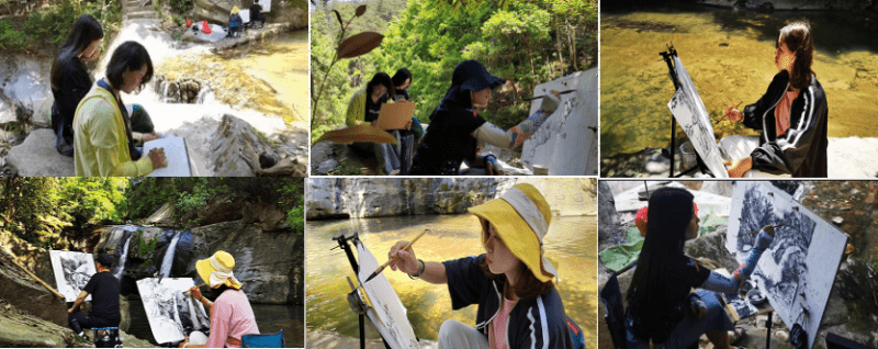 深入生活、走进大自然去呼吸新鲜空气,以静观众景,以达到外师造化,中得心源的境地。到达目的地后,大家游走山林间踩点寻找创作处。 图2:山间小道,溪边踩点