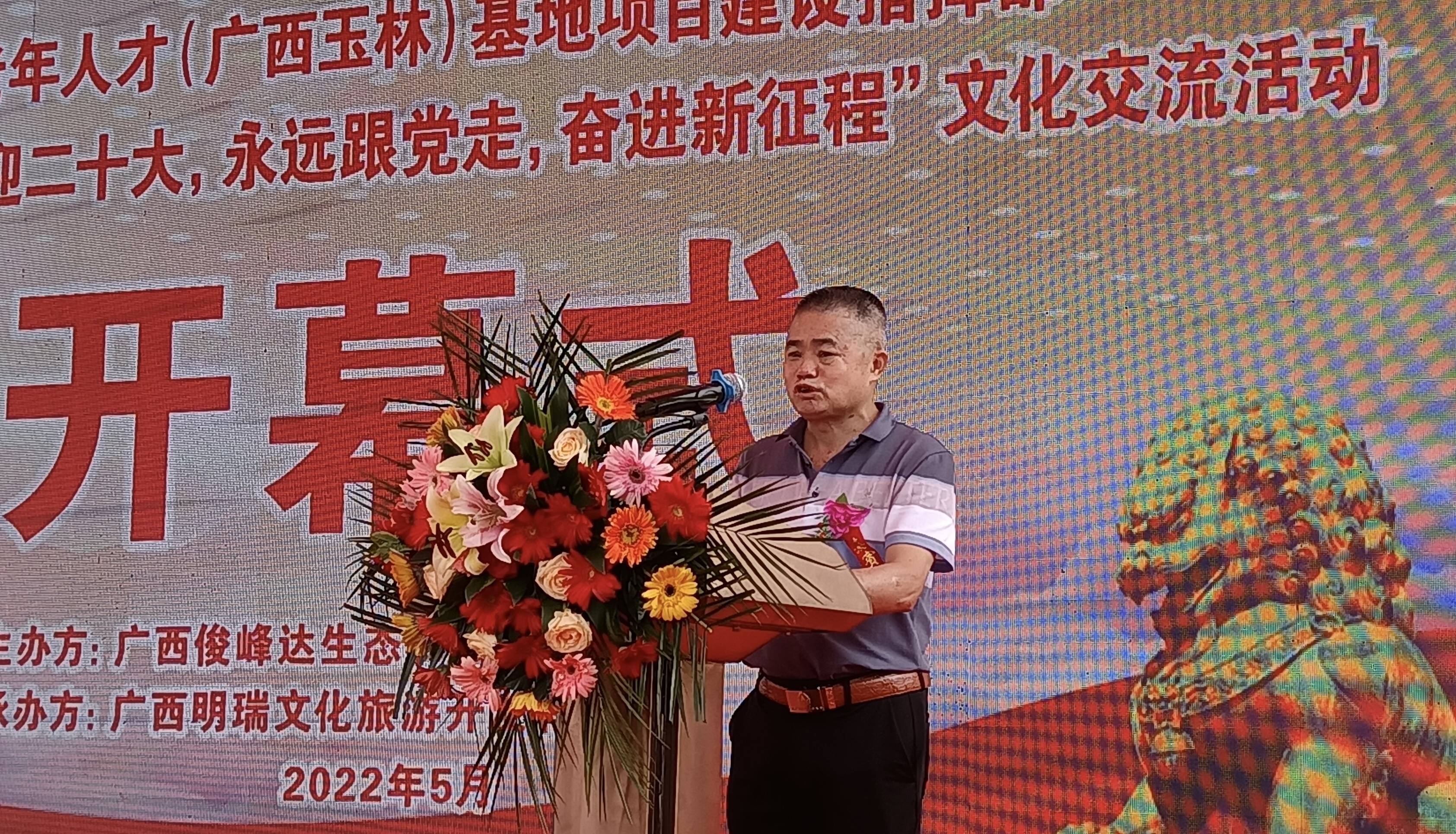在开幕式开始前,盛邀而来的嘉宾们还兴致勃勃参观清湾镇侯山村的“虎将堂”,零距离聆听了李明瑞后裔李万理对虎将堂名人的历史介绍,从中深受感动。当天中午十一时多,活动正式拉开序幕,原全国老龄委刘俊岩先生发表了热情洋溢的讲话,对全国老年人才(广西玉林)基地建设指挥部开工仪式暨“喜迎二十大,永远跟党走,奋进新征程”文化交流活动表示热烈的祝贺,该基地建设一路走来,在各级党委政府、领导的大力支持下,历经六七年的艰苦努力,终于迎来开工建设的喜庆时刻,希望全国老年人才(广西玉林)基地尽快进入快车道,尽早开工,并表示了衷心的祝愿。