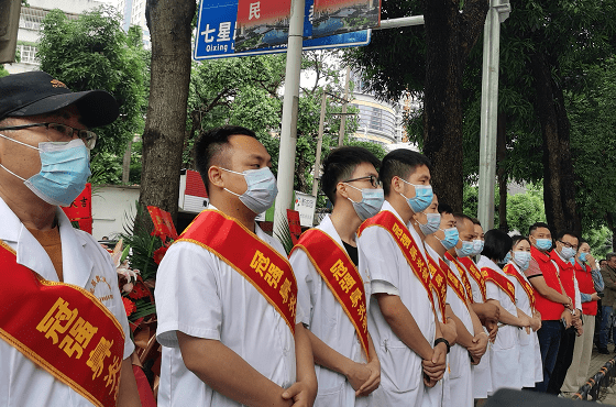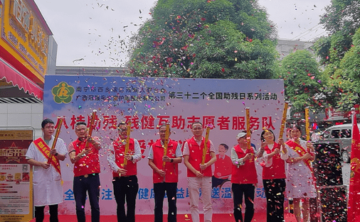 为庆祝第32个全国助残日,5月15日下午,广西冠强鼻炎堂护理股份有限公司联合南宁医博中医肛肠医院、广西医大晶亮眼科医院、广西无障爱科技有限责任公司等爱心企业,共同举办了“八桂助残,残健互助志愿者服务队”的授旗仪式暨助残活动启动仪式,在南宁市天桃路举行。