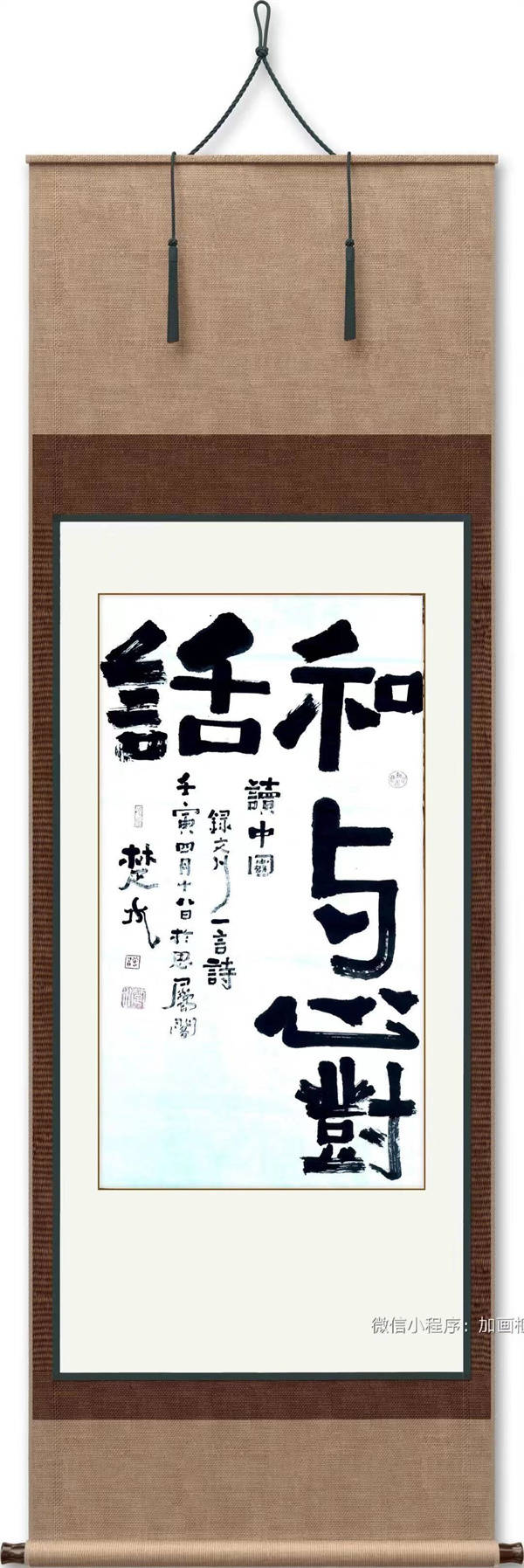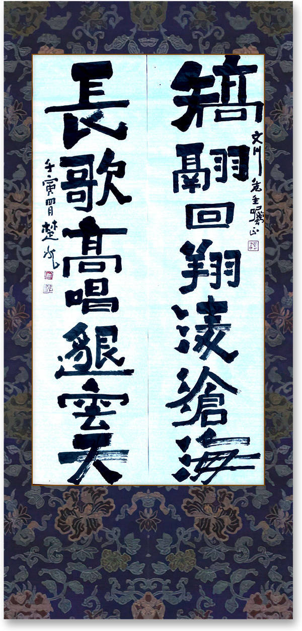 中国新诗百年,在文化历史的长河里,尚属沧海一粟,一直在寻找自己的形式,形成自己的传统。老楚同志认为诗应该朗诵出来,才能恢复诗本已固有的文化传统。这几年来,文川诗友群里每天从未间断的朗诵,就是对诗歌朗诵的文化传统之回归,而尽地最大努力,所以,值得肯定。而中国新诗的书写,究竟是横写,还是坚写,分行与否,有无标点符号,还处在探索过程,于是乎,就按着我的理解,多留了一些空白,而写下了文川先生这首《读中国》,并爨字以赠: 矫翮回翔凌沧海 长歌高唱邈云天