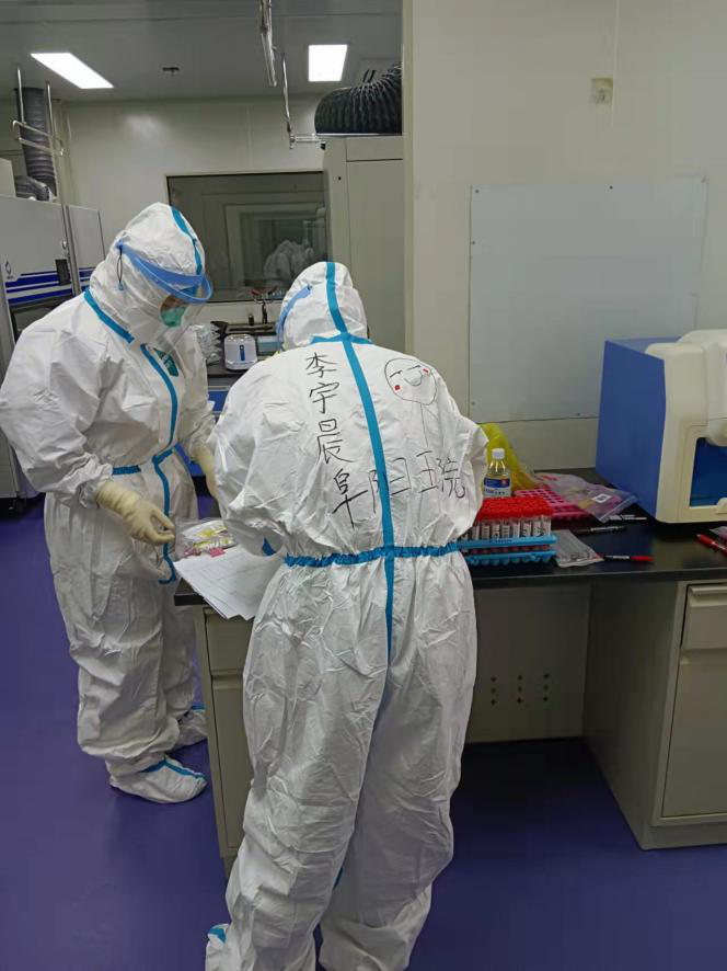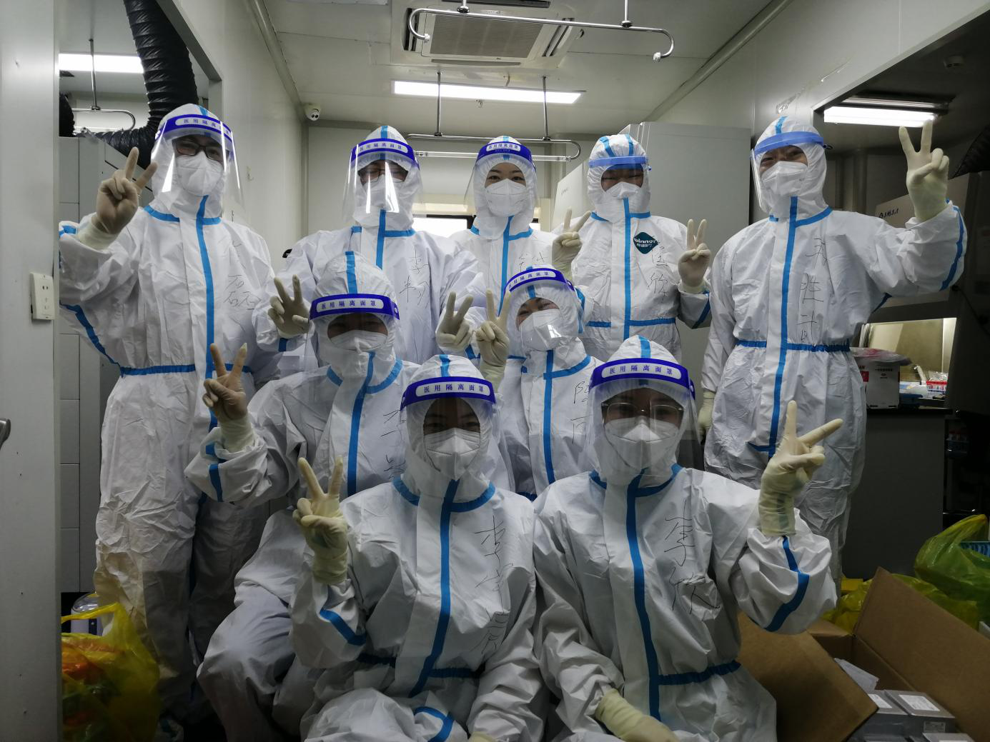 核酸检测要与可能含有新型冠状病毒的标本“亲密接触”,具有较高的风险。检测人员必须穿戴密不透气的防护装备在仅有10多平方米的负压实验室内,连续工作至少8个小时,期间不能喝水、不能上厕所。每次脱下厚重的防护装备,他们身上的衣服总是被汗水浸透了,脸上也压出了深深的印痕。日夜奋战使大家体力不支,病毒肆虐让大家感到随时存在被感染的风险,但全体队员团结协作,义无反顾地与病毒正面交锋,及时准确,无一差错发生。面对突如其来的疫情,他们义无反顾,不惧生死,克服困难,科学严谨,认真负责,不辱使命。无愧于党,无愧于人民!