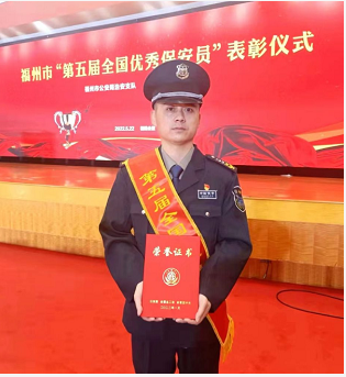 福州保安协会会长伍敏强在代表主办单位致辞时指出,当前福州保安事业保持良好的发展势头,各项工作均取得了欣喜的成绩。福州保安队伍以守万家灯火、护一方平安为己任,始终争当排头兵,坚持走前列,以无私的奉献精神和饱满的工作热情,在防风险、战疫情、保安全、护稳定等工作中,脚踏实地、埋头苦干、拼搏进取、忘我工作,在守护省会平安建设的平凡岗位上创造出骄人的工作业绩,为护航经济社会发展做出了突出贡献,涌现出一批先进的保安员代表。此次全国优秀保安员表彰仪式,是树立典型、学习先进的重要活动,更是统一思想、再接再厉的动员会。他希望以此为契机,致力于打造纪律更严、业务更熟、形象更好、服务更专的省会保安队伍,提升在维护社会秩序、协助破获案件、预防灾害事故等方面的能力水平,为保障人民安居乐业、促进经济社会发展做出更大的贡献,以忠实履职尽责的实际行动和勇于担当作为的昂扬斗志,践行对党和人民的无限忠诚。 ![]() 福州市公安局治安支队支队长陈革向“第五届全国优秀保安员”张永贵颁奖 ![]() 福州市“第五届全国优秀保安员”张永贵 据悉,荣获这次“全国优秀保安员”表彰的张永贵,从事保安事业已有十几年的积淀,业务精湛,技能突出,2017年还代表中国国家队出征第七届世界传统武术锦标赛荣获金牌,现任精武特卫集团公司副总。他表示,荣誉只代表过去,未来当继续努力!他非常珍惜“全国优秀保安员”这份荣誉,也感恩精武特卫公司对自己的多年培养,他会以此为动力,不忘初心,再接再厉,忠诚履职尽责,奋力担当作为,在平凡的岗位上再创佳绩,展现当代保安员的风采! ![]()