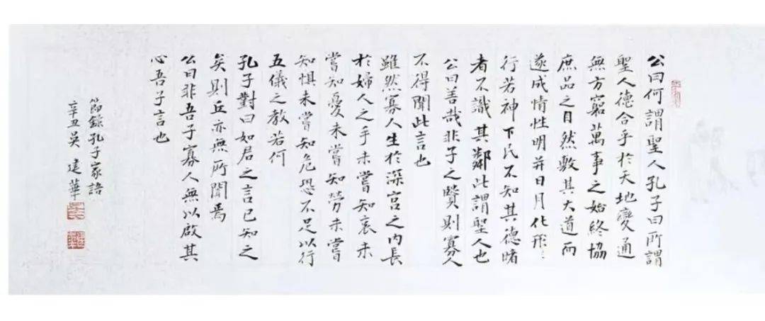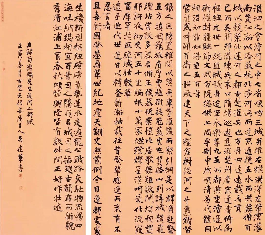 建华师从著名书法家姜华先生,在跟老师的习书过程中,他从适园获得了更多的理论滋养和人生感悟。比如豁达、比如热烈、比如雄健、比如大气,把自己的秉性和气质融入到自己的作品中去。字法、笔法、墨法、章法乃为技;情感、架构、学识、修养可近艺;人文合一、文书合一、人书合一可臻道也。鉴于此,他对自己的书法理论学习和书法技艺探研要求得更高。建华知道,近些年来新书派和传统书派构成了中国书法创作的独特风景,新书派在注重内容的同时更注重形式,而传统书派则对书法进行传统意义的坚守。所以建华有着自己清醒的认识,在他心中书者首先要打下坚实的书法功底,有了功底作铺垫,作品的神采方能展开。无论新书派或传统书派,只要处理好创作中的“本”“末”问题,一切的矛盾都会迎刃而解。新书派不能脱离传统书法的滋养,传统书法也不能固守“传统”而一层不化。脱离了书法传统的新书派是无源之水,没有创新意识的传统书派也会与时代背道而驰。理解了“本”“末”的关系问题,新书派和传统书派的书法创作就多了一份沟通和理解,就多了一份圆融和豁达。展现在我们面前建华的书法大小皆擅、五体俱佳、文墨并重,其楷书清丽内敛不失儒雅稳健,行草潇洒飘逸不失力量对比,隶书厚实质朴不失俊朗灵动,篆书古朴方正不失月朗清风。在建华的书房里呈现着“水润淮安”的坚韧与柔情,在他的理念中,书法是表达内心世界的波澜壮阔。