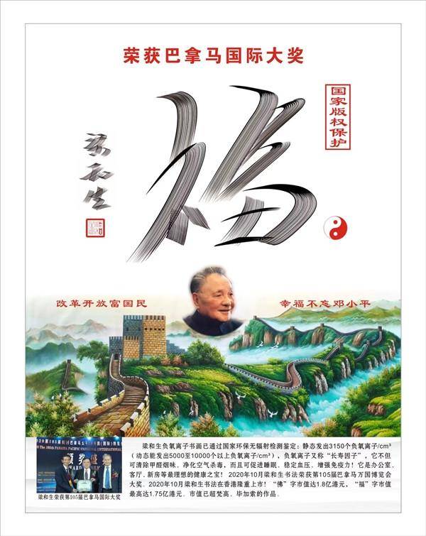 梁和生与师傅张文祥 他把周易五行与书画结合,创造了《风水书法》、《易经书法》等, 第一个荣获巴拿马国际大奖的书法家! 他把金融资本与书画结合 ,第一个书法在香港上市,“福”和“佛”的市值高达1.8亿港元! 他把科技与书画结合 ,第一个发明负氧离子书法,使办公室充满森林般的负氧离子空气,通过了中国国家及欧盟环保检测! 梁和生向超2000名学生儿童捐款捐物,获“中国十大杰出爱心人物”荣誉! 梁和生此次被哈佛大学艺术学院增补为荣誉院士,也确实说明梁和生属中国顶尖艺术人才了。 梁和生代表作汇报: 2020年11月12日,佛字在香港上市,市值最高达1.8亿港元