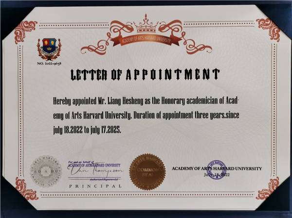 荣誉院士证书 近日,著名书画家梁和生增补为哈佛大学艺术学院荣誉院士。 哈佛大学艺术学院座落于波士顿,是集艺术创作 、艺术教育、艺术科研为一体的世界顶尖艺术学院,有艺术、舞蹈、戏剧、影视、音乐、制作等六大学院!属世界一流名校,常年荣居U.S.NEWS排名榜!