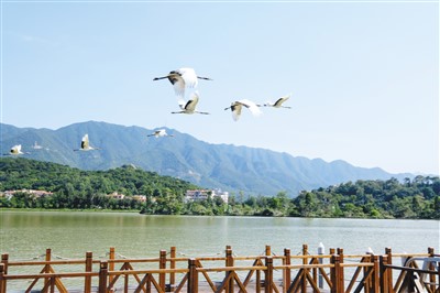 飞鸟翱翔星湖之上。