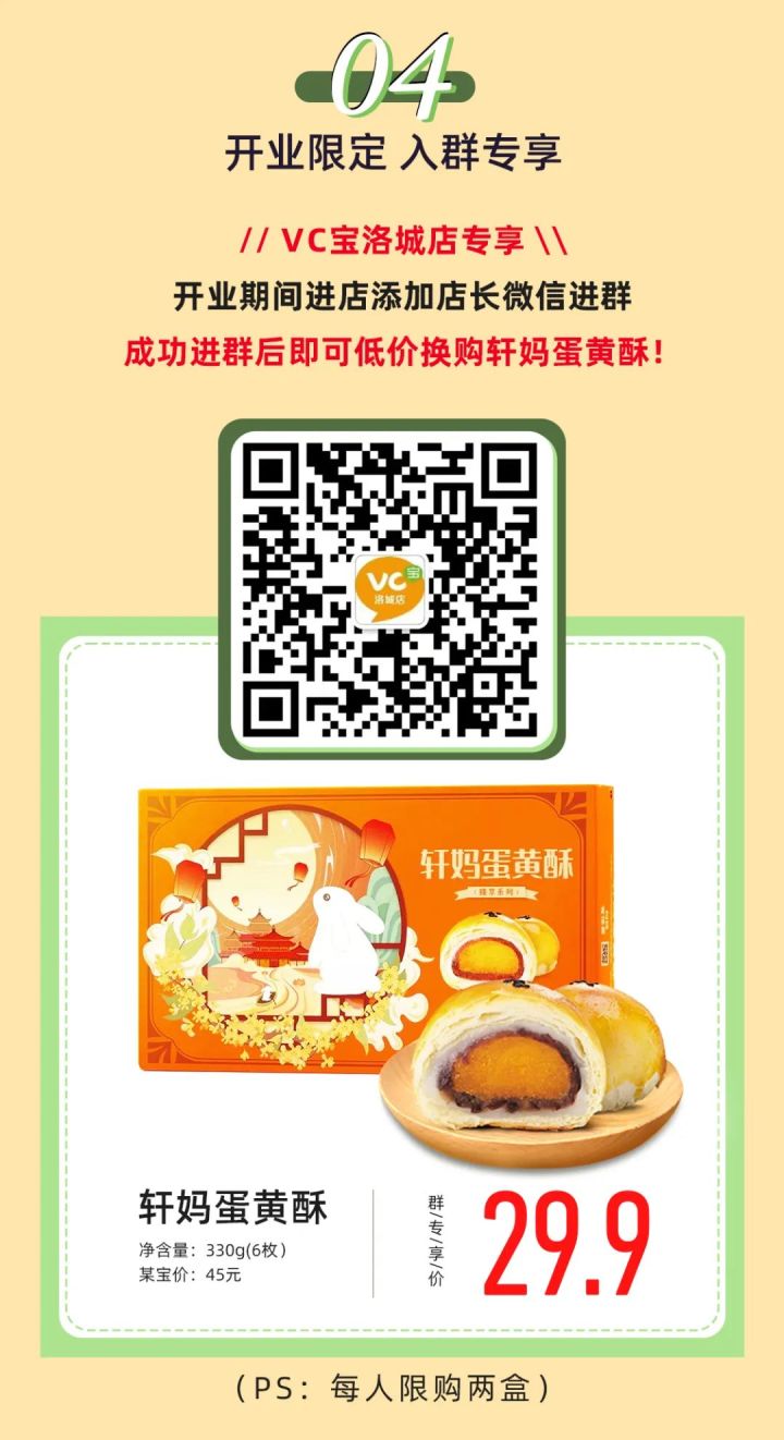 03 任意消费即得百元券 VC宝直营门店同享 任意消费得120元券 分分钟实现水果自由! ![]() 04 开业限定 入群有好礼 开业期间,添加VC宝洛城店店长微信 成功进群后可低价换购轩妈蛋黄酥 每个会员账号限购2盒 ![]() ![]() 05 新人福利光环 现在!立刻! 新人注册公众号 即可得68元优惠券 全城燃爆!鲜果裸价狂甩4天! ![]() 一切准备就绪, 娇艳欲滴的新鲜水果闪亮登场 关键是让你怦然心动到尖叫的抄底价格 属于洛城人的福利,来了! ![]()