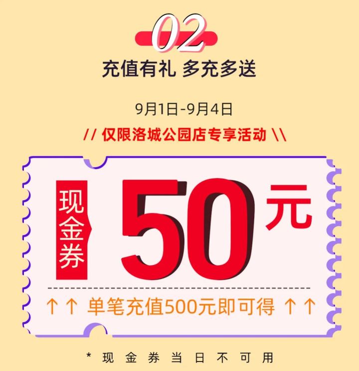 ![]() ![]() ![]() ![]() 02 充值有好礼 VC宝洛城公园店充500送50,多充多送 (当日不可用) 福利就是这么直接又刺激! ![]()