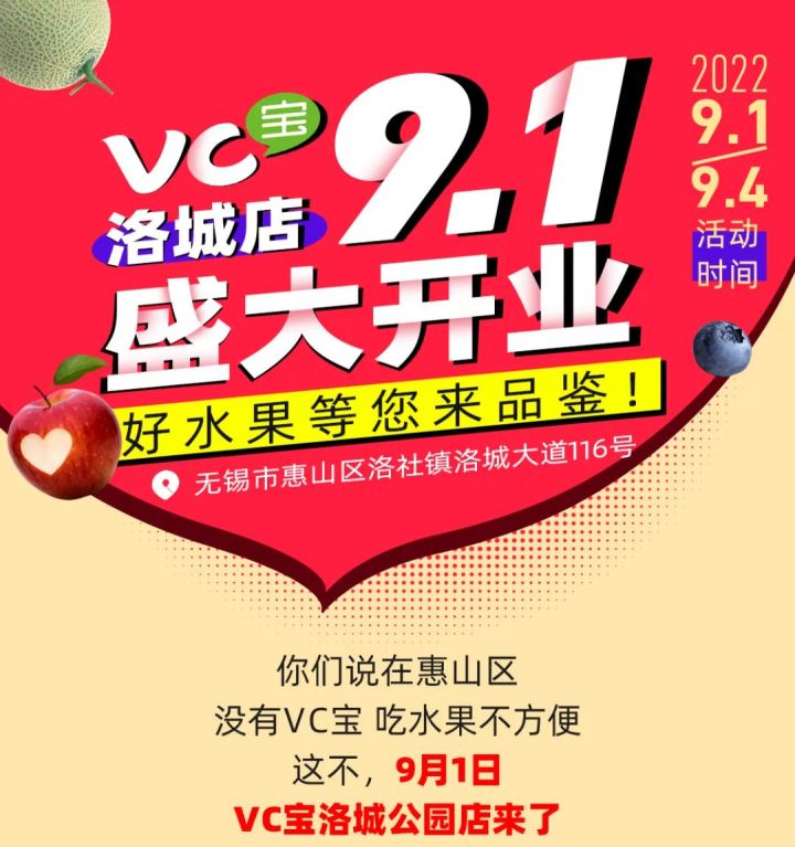 OMG ! 再也不用担心家门口 吃不到味美价更优的水果了! 因为 水果连锁品牌 VC宝洛城店9.1开业啦 ![]() 空降惠山区 款款爆款,款款好吃 开在家门口的维c能量补充站等你来品鉴 ![]() 开业钜惠ing~ 活动时间:9月1日-9月4日 连续4天好礼钜惠等你来! ![]()