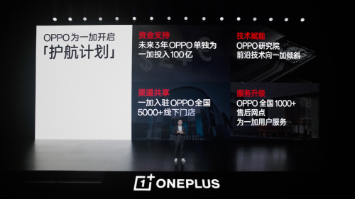 此外,OPPO将正式开启“护航计划”,为一加发展保驾护航。OPPO将在未来三年单独为一加投入 100 亿资金支持;OPPO研究院、研发部门的领先技术,特别是性能赛道的前沿技术,会优先向一加倾斜,让一加的产品快速应用到行业顶尖的技术;在渠道和服务层面,一加已入驻OPPO全国超 5000 家线下门店,OPPO全国 1000 家服务网点向一加用户开放,提供同等优质的售后服务。