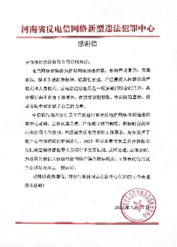 ——中信银行 “哨兵” 智能反欺诈 系统主动保护被诈资金超亿元 近年来,中信银行践行“金融为民”理念,持续构建电信诈骗防范体系,深层次筑牢金融反诈防线,打击电信网络诈骗、切实保护消费者权益,有力保障了客户资金安全。 联防反诈警银协作成果显著 针对反诈的难点,中信银行紧盯技术反制,通过工作专班机制和多层级考核体系,压实各级责任;健全账户分类分级管理机制,根据客户需求及其特征,匹配合理的非柜面交易限额;应用人脸识别技术,对高风险账户或业务进行增强核验,有效防范账户“实名不实人”;上线手机号实名核验功能,提高客户预留信息真实性;充分运用大数据、图谱分析等技术,提升防控能力。 同时,中信银行强化警银协同,加大与公安、通信等部门协作配合,及时对公安部门移送的涉案、可疑等风险账户进行管控;完善对接有权机关系统,支持有权机关快速管控涉案资金;积极向公安部门提供风险线索,为涉案人员抓捕和案件侦破提供助力,全面开展“断卡”行动,牢牢守住人民群众的“钱袋子”。 2022年全年,中信银行“哨兵”智能反欺诈系统通过电话核实、弹窗警示、交易阻断等机制,主动劝阻被诈骗客户860人,拦截资金1.12亿元;查控涉赌涉诈账户2.34万户,管控资金2.65亿元。由于在警银协作反诈过程中的突出表现,中信银行各地分行在帮助客户阻断金融诈骗后,受到当地公安机关的表扬或感谢,对中信银行在打击治理电信网络新型违法犯罪方面的积极配合表示肯定。
