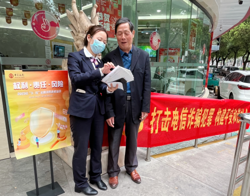 为纵深推进打击治理电信网络诈骗新型违法犯罪工作,充分发挥中国银行丽水莲都支行“丽水市老年人金融服务示范点”标杆作用,进一步提升广大群众和中老年客户金融素养,预防减少电信诈骗案件的发生,强化金融消费者风险责任意识。3月15日,中国银行丽水莲都支行积极开展以“打击电信诈骗犯罪,构建平安和谐社会”为主题的3·15消费者权益日宣传活动。
