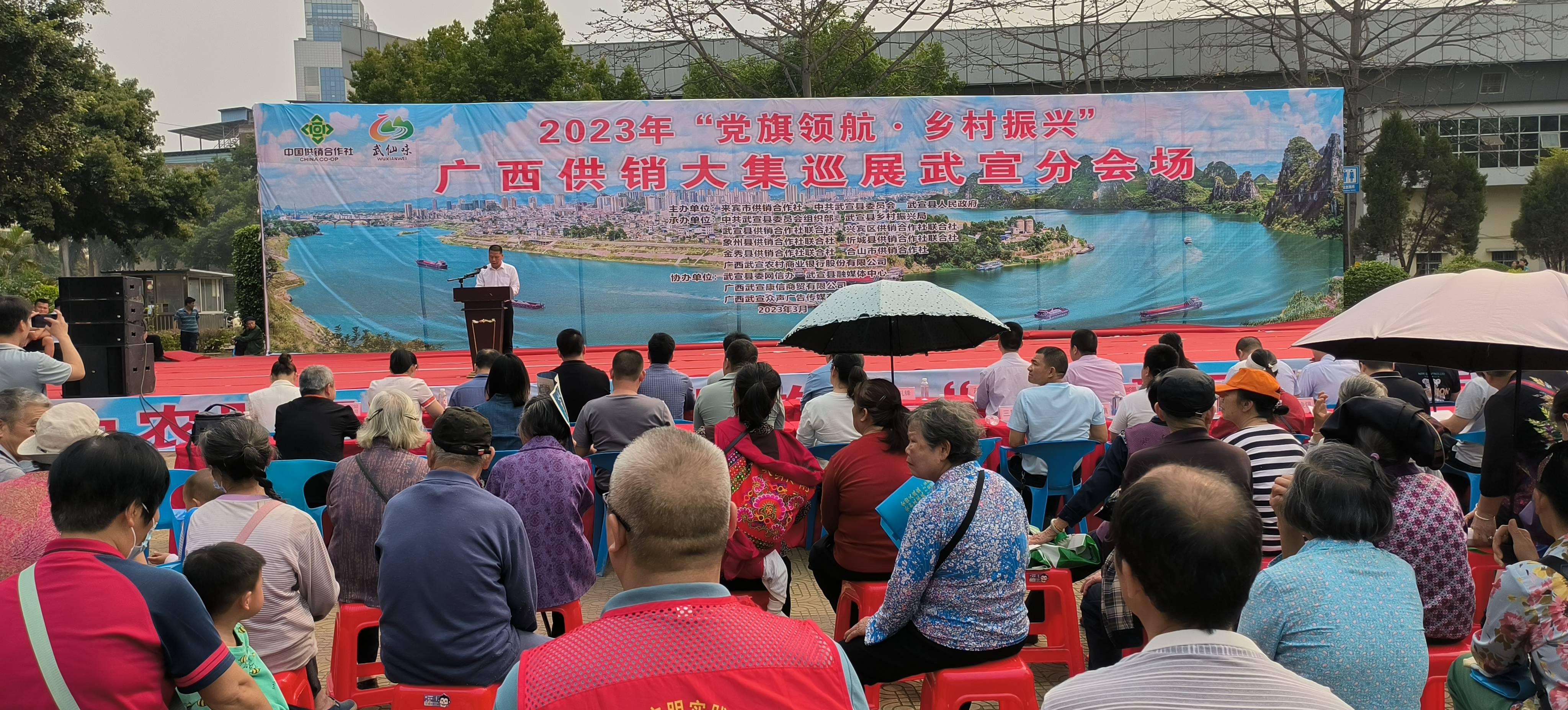 3月23日上午10时,由来宾市供销社、中共武宣县委员会、武宣县人民政府主办,武宣县委组织部、武宣县乡村振兴局、武宣县供销合作社联合社、兴宾区供销合作社联合社、象州县供销合作社联合社、忻城县供销合作社联合社、金秀县供销合作社联合社、合山市供销合作社联合社、广西武宣农村商业银行股份有限公司承办,武宣县委网信办、武宣县融媒体中心、广西武宣康信商贸有限公司、广西武宣众声广告传媒有限公司协办的“党旗领航·乡村振兴”广西供销大集巡展武宣分会场农产品展销会启动仪式,在武宣县城马鞍山广场隆重举行。