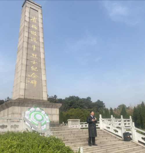 清明时节,祭奠英烈。3月27日上午,江苏好人、镇江市丹阳市两级政协委员、江苏万善律师事务所创办人丁斌,应丹阳市埤城中学杨勇杰校长之邀,在庄严肃穆的丹北镇雀梅墩烈士陵园,为埤城中学260多名初一学生宣讲了革命烈士的英勇事迹。这是丁斌律师第三次受邀在这开展这样的爱国主义教育活动。 丁斌律师介绍,雀梅墩烈士陵园是爱国主义教育基地。希望通过革命烈士的英勇事迹,让同学们瞻仰烈士的生平、缅怀先烈,从而让同学们不忘历史,并激发内心的爱国热情和民族情感。