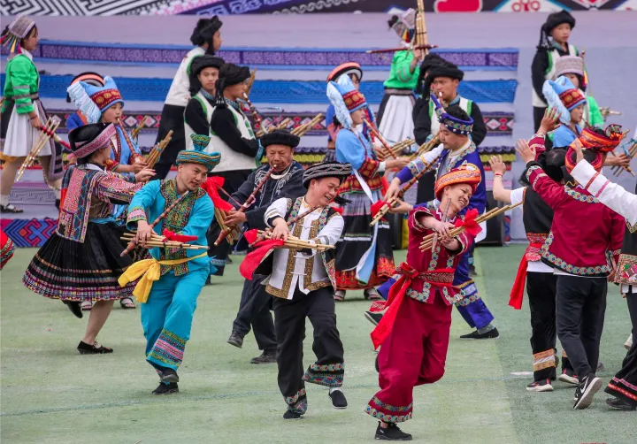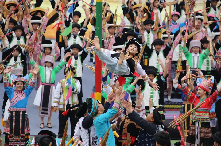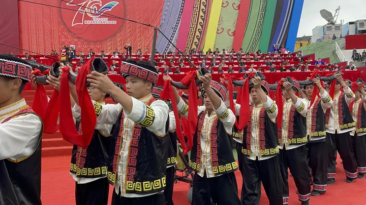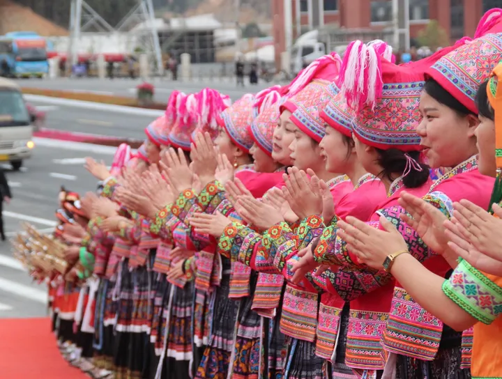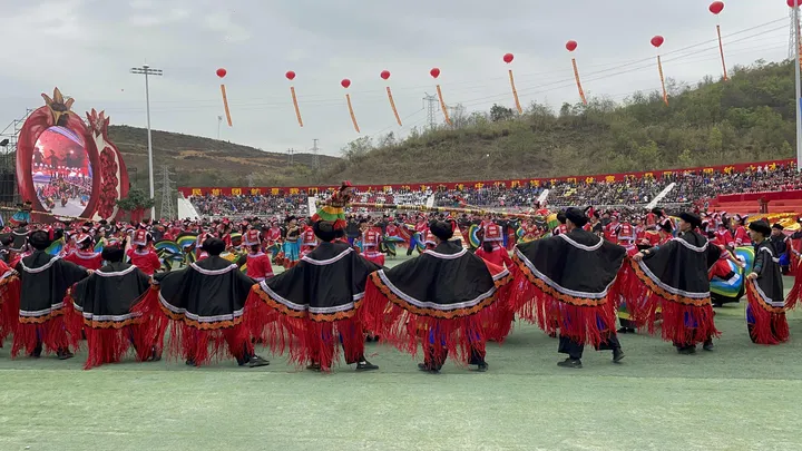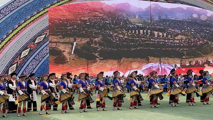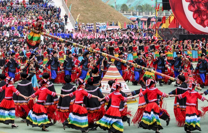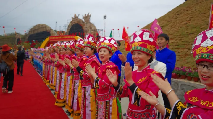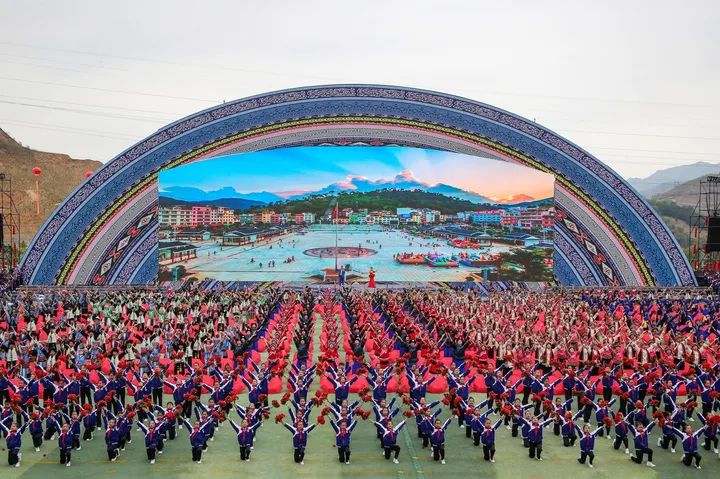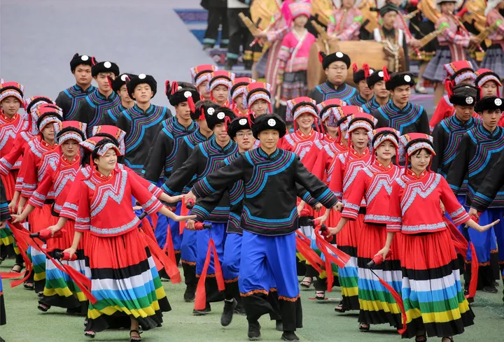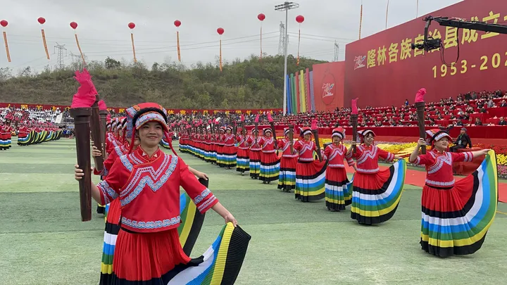 ![]() 彝族篇《火韵 · 彝家情》 当天的庆典活动缤纷多彩,大型广场歌舞以“山水隆林·五彩旋律”为主题,始终贯穿“中华民族一家亲,同心共筑中国梦”的主题思想,由序“欢腾的山乡”以《追梦族群》《和美家园》《腾飞隆林》三个篇章8个节目组成,充分展现全县各族人民团结奋进,奋发图强,创造奇迹,共同开创美好未来,民族事业在腾飞,隆林在腾飞的历史进程。