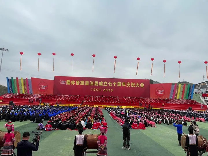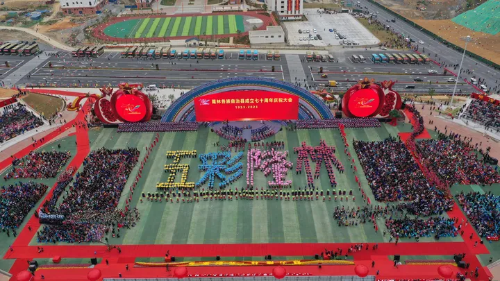 ![]() 庆祝大会现场。(来自航拍) 3月28日,隆林各族自治县到处洋溢着一片喜气祥和的气氛,在隆林民族高中体育场,宾朋满座,数万各族群众欢聚在一起,热烈庆祝自治县成立70周年。全国人大民委、国家民委祝贺团、自治区代表团、百色市代表团全体成员以及各方嘉宾带着深情厚谊和美好祝福莅临现场,与隆林各族同胞载歌载舞共庆70华诞。