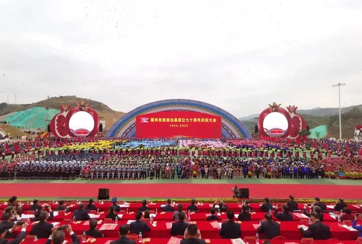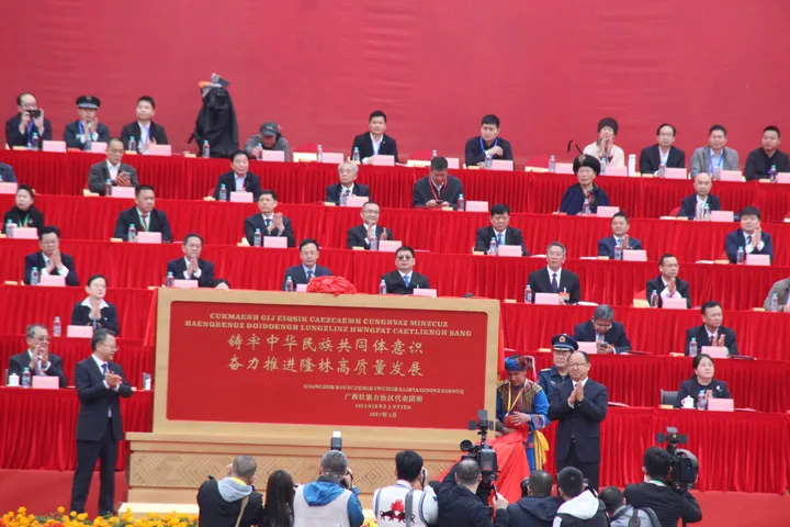 ![]() 庆祝大会现场。 国家民委协调推进司一级巡视员,全国人大民委、国家民委祝贺团团长温军,自治区党委常委、统战部部长,自治区代表团团长王心富,自治区第十三届人大常委会副主任、党组书记,自治区代表团副团长王跃飞;自治区副主席、自治区代表团副团长苗庆旺;自治区政协副主席、自治区代表团副团长黄俊华;广西军区政治工作局大校主任、自治区代表团副团长辜协辉;百色市委书记、百色市代表团团长黄汝生出席庆祝大会。
