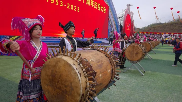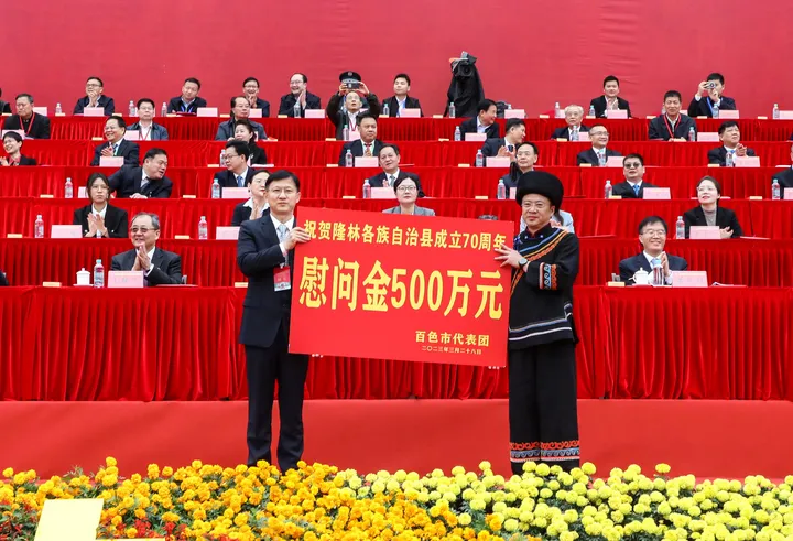 ![]() 自治区代表团向隆林各族自治县赠送贺匾。 全国人大民委、国家民委、自治区和百色市分别向隆林各族自治县发来贺电。国家民委专门给隆林送来文艺慰问演出。自治区代表团、百色市代表团分别向隆林赠送贺匾、贺礼。