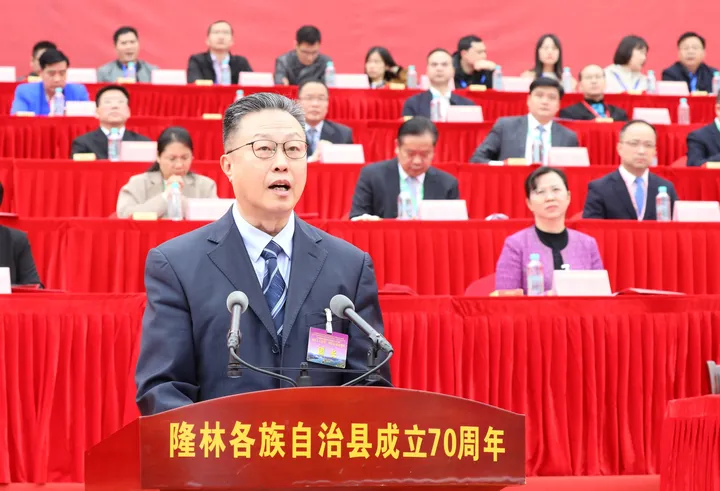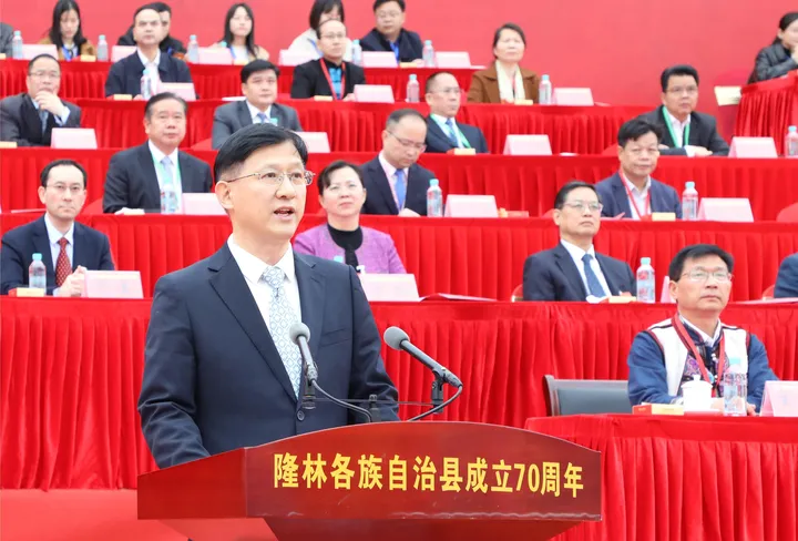 ![]() 温军致辞。 温军寄语隆林各族人民,新时代新征程要有新气象,更要有新作为,希望隆林各族自治县干部群众更加紧密地团结在一起,以新时代中国特色社会主义思想为指导,深刻领悟“两个确立”决定性意义,增强“四个意识”、坚定“四个自信”、做到“两个维护”,不断铸牢中华民族共同体意识,推进新时代党的民族工作高质量发展,为全面建设新时代壮美广西、全面推进中华民族伟大复兴作出更大贡献!